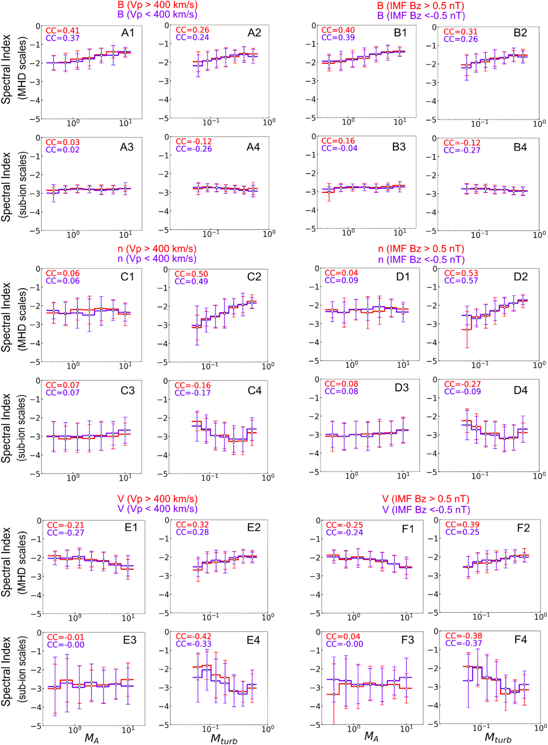 Comparisons of the relations between the turbulence spectral indices and ﹩{M}_{{\rm{A}}}﹩, ﹩{M}_{\mathrm{turb}}﹩ for different upstream solar wind conditions, such as the averaged z-component of interplanetary magnetic field (IMF Bz) and the solar wind speed (Vp).