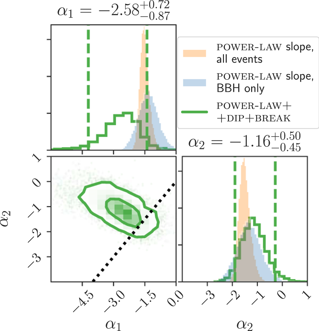 Joint posterior on the power-law slopes α1 (NS mass range) and α2 (BH mass range) for the full POWER LAW + DIP + BREAK model (green). The two-dimensional contours show 50% and 90% credible regions, while vertical dashed lines show one-dimensional 90% credible intervals. For comparison, we show the power-law slope inferred under the POWER-LAW fit to (blue) only the BBH and (orange) all GWTC-1 events. We recover α1 < α2 with 91% credibility; α1 = α2 in this model reduces to the POWER LAW + DIP model.