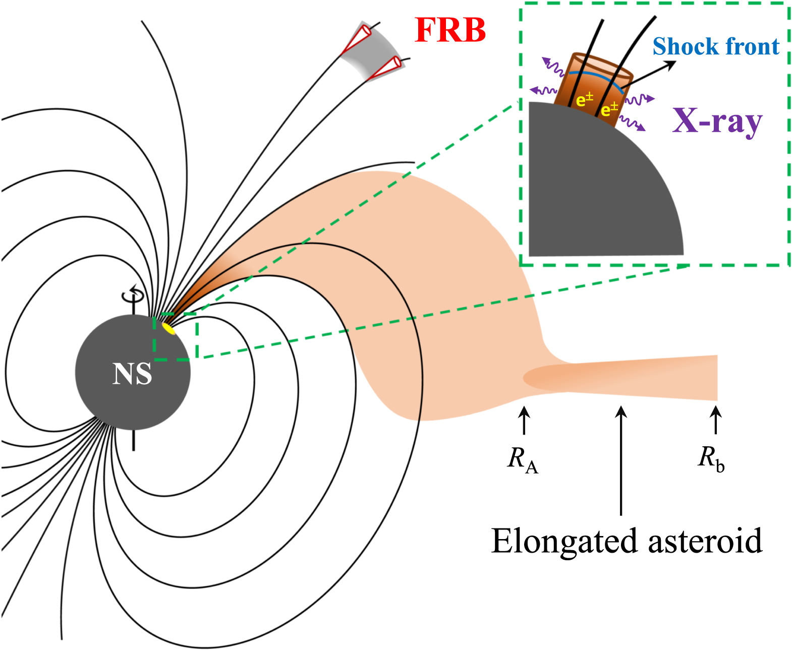 Schematic illustration of the impact between an asteroid and a magnetar. The asteroid gets elongated after entering Rb and further accreted along field lines within RA. An instant accretion column is formed after collision onto the magnetar surface, producing a Comptonized X-ray burst and an FRB in the magnetosphere.