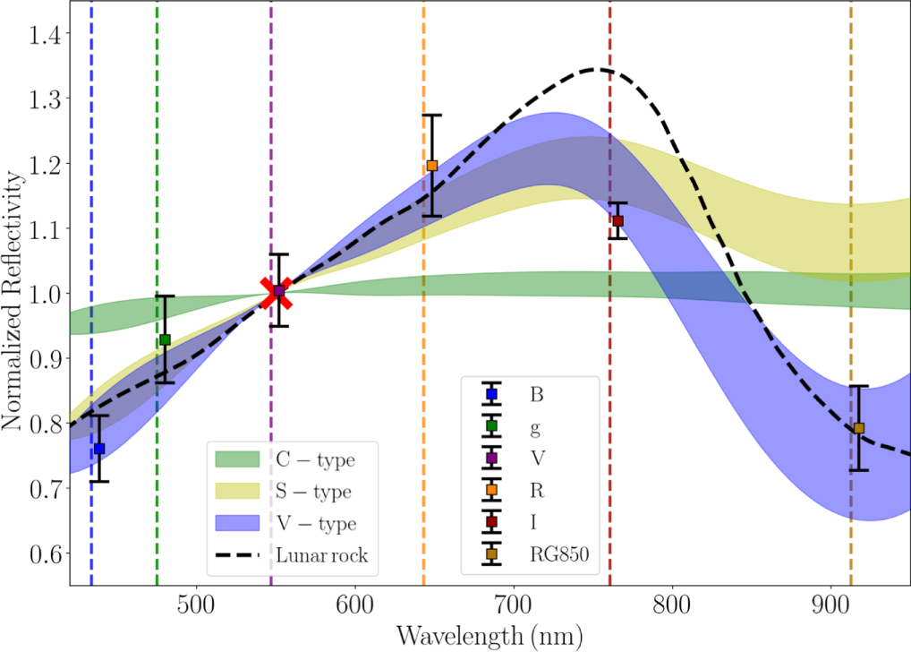 Reflectance photometric spectrum of 2020 CD3 consisting of B, g, V, R, I, and RG850 observations of 2020 CD3 on 2020 March 23 UTC. The λeff locations of the B, g, V, R, I, and RG850 filters have been plotted as vertical dashed lines. The data points for the normalized reflectivity of 2020 CD3 have been offset slightly from their location in the wavelength direction. The error bars on the spectrum data points correspond to 1σ uncertainty. The spectrum has been normalized to unity at 550 nm, indicated by the red cross. The spectral range of S-, V-, and C-type asteroids from the Bus–DeMeo asteroid taxonomic catalog (DeMeo et al. 2009) is overplotted, with the V-type spectrum most closely resembling the spectra of 2020 CD3. The average spectrum of coarse bulk lunar rock samples is plotted for reference (Isaacson et al. 2011).