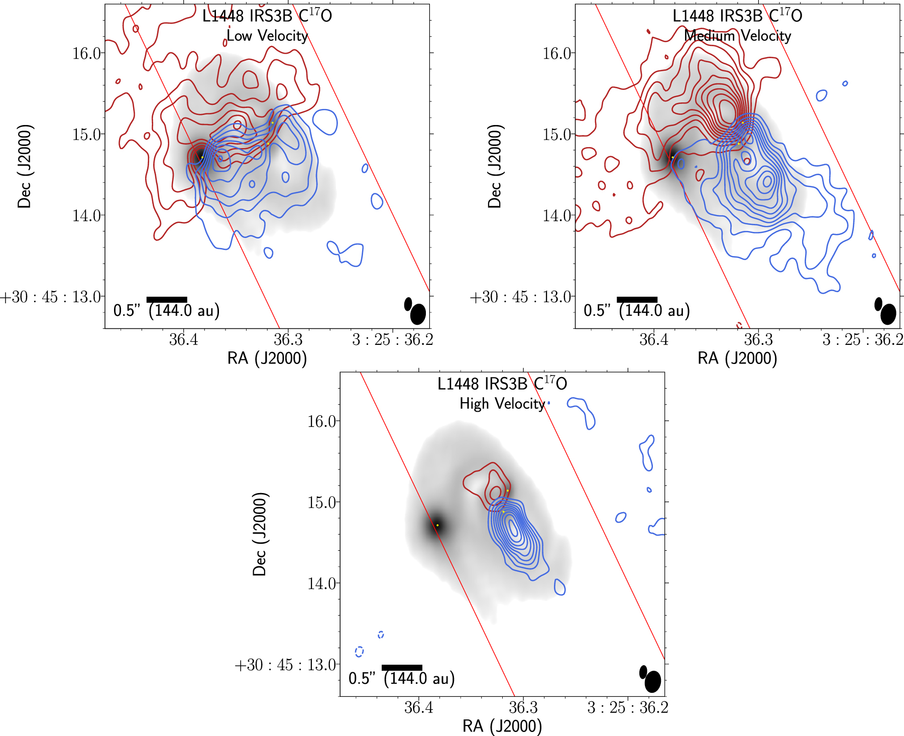 C17O integrated intensity maps toward IRS3B over a selected range of velocities overlaid on continuum (gray scale). The C17O emission traces the rotating gas within the disk via Doppler-shifted emission. The panels correspond to low-, medium-, and high-velocity ranges. The following panel descriptions will be noted red (blue), corresponding to the Doppler shifted emission. Negative contours are not present in these integrated intensity maps; however, at the location of IRS3B-c, there is strong absorption that is evident in the high spectral resolution data cube but is not represented here. The red lines indicate the region extracted for PV diagram construction, along the position angle of the major axis. Low velocity: velocity range starts at 4.68 ﹩\to ﹩ 5.67 km s−1 (3.58 ﹩\to ﹩ 4.68 km s−1) and contours start at 8σ (8σ) and iterate by 3σ (3σ) with the 1σ level starting at 0.0023 (0.0025) Jy beam−1 for the red (blue) channels, respectively. Medium velocity: velocity range starts at 5.67 ﹩\to ﹩ 6.66 km s−1 (2.48 ﹩\to ﹩ 3.58 km s−1) and contours start at 3σ (5σ) and iterate by 3σ (3σ) with the 1σ level starting at 0.002 (0.0016) Jy beam−1 for the red (blue) channels, respectively. High velocity: velocity range starts at 6.66 ﹩\to ﹩ 7.65 km s−1 (1.27 ﹩\to ﹩ 2.48 km s−1) and contours start at 5σ (5σ) and iterate by 3σ (3σ) with the 1σ level starting at 0.0018 (0.0012) Jy beam−1 for the red (blue) channels respectively. The C17O synthesized beam (0.″21 × 0.″13) is the bottom rightmost ellipse on each of the panels, and the continuum synthesized beam (0.″11 × 0.″05) is offset diagonally.