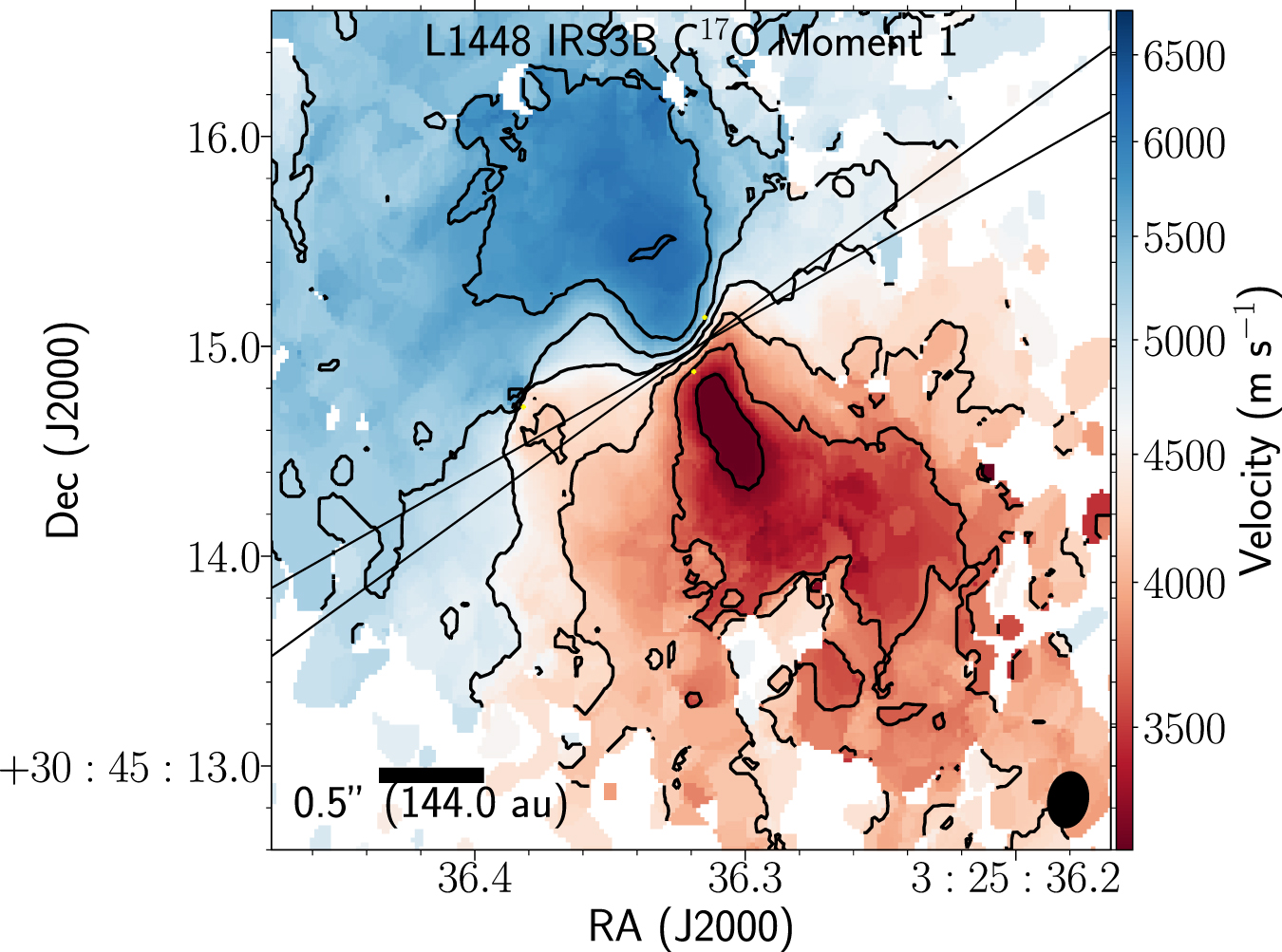 C17O velocity-weighted integrated intensity maps toward IRS3B and IRS3A over a selected range of velocities (1.27 ﹩\to ﹩ 7.65 km s−1) The C17O emission appears well ordered across the semimajor axis. The contours denote the 0.5 km s−1 velocity offsets from system velocity of 4.8 km s−1. The yellow markers indicate the three continuum sources. The black lines indicate the position angle of the minor disk estimates as given by the pdspy fitting routine in Table 4, of ﹩90+{26.7}_{-2.9}^{+1.8}﹩°. The C17O synthesized beam (0.″21 × 0.″13) is the bottom rightmost ellipse.