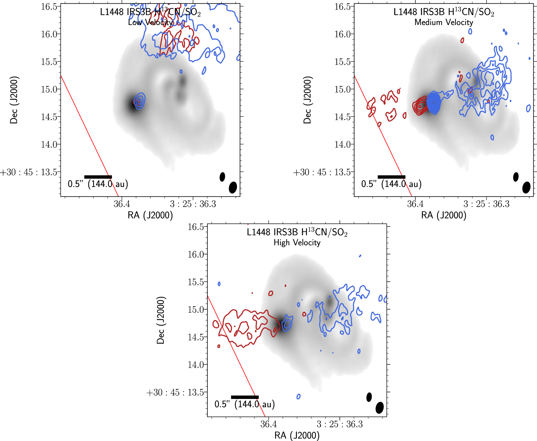 H13CN/SO2 integrated intensity map toward IRS3B appears to trace near the outflow launch location from the tertiary, IRS3B-c. There is pretty large asymmetry in the velocity channels covered by the red- and blueshifted emission. The panels correspond to low-, medium-, and high-velocity ranges. The following panel descriptions will be noted red (blue), corresponding to the Doppler shifted emission. Low velocity: velocity ranges 5.2 ﹩\to ﹩ 7.2 km s−1 (4 ﹩\to ﹩ 4.8 km s−1), contours start at 5σ (5σ) and iterate by 2σ (5σ) with the 1σ level starting at 0.0025 (0.0021) Jy beam−1 for the red (blue) channels. Medium velocity: velocity ranges 7.2 ﹩\to ﹩ 9.2 km s−1 (3.2 ﹩\to ﹩ 4 km s−1), contours start at 5σ (5σ) and iterate by 2σ (2σ) with the 1σ level starting at 0.0016 (0.0016) Jy beam−1 for the red (blue) channels. High velocity: velocity ranges 9.2 ﹩\to ﹩ 11.2 km s−1 (1.6 ﹩\to ﹩ 3.2 km s−1), contours start at 4σ (4σ) and iterate by 3σ (3σ) with the 1σ level starting at 0.0021 (0.0021) Jy beam−1 for the red (blue) channels. The H13CN synthesized beam (0.″22 × 0.″14) is the bottom rightmost ellipse on each of the panels, and the continuum synthesized beam (0.″11 × 0.″05) is offset diagonally.