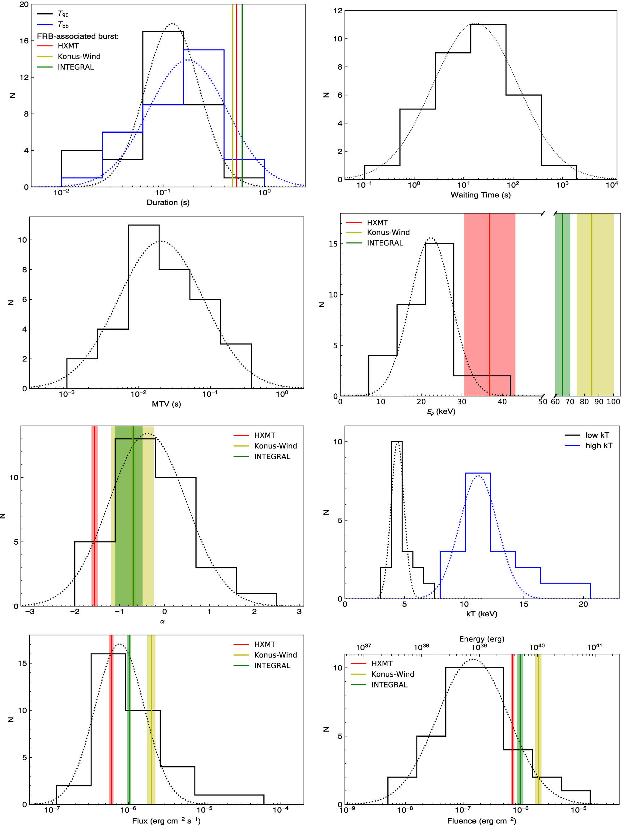 Distributions of characteristic timescales, time-integrated spectral fitting parameters, and other derived parameters. Flux, fluence, and energy are calculated in the energy band of 8–200 keV. The dotted curves are the best Gaussian fits to the histograms. The red/green/yellow vertical lines and corresponding shadow areas represent the parameter values and errors of the FRB-associated burst obtained with HXMT/INTEGRAL/Konus-Wind (Li et al. 2020; Mereghetti et al. 2020; Ridnaia et al. 2020).