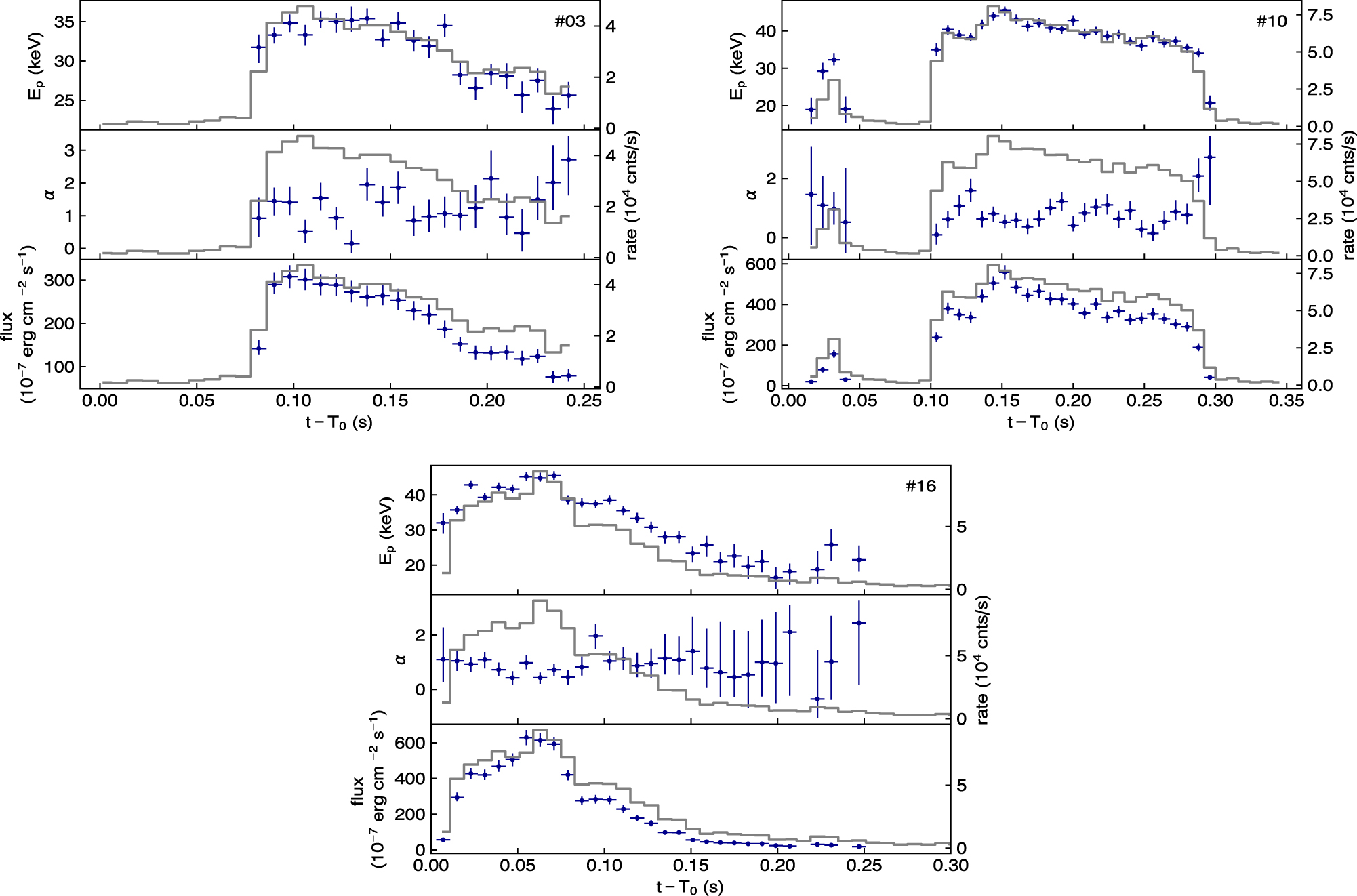 Spectral evolution of the top three brightest bursts. The CPL parameters, Ep, α, and the derived flux are plotted on top of the light curves.