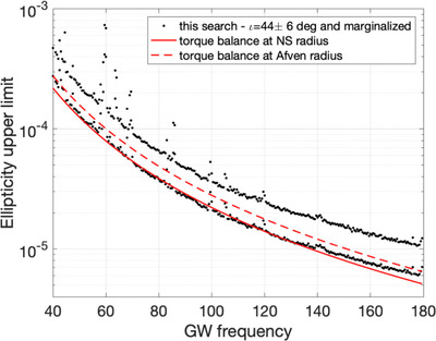 Upper limits on the ellipticity of the neutron star, derived from the gravitational-wave intrinsic amplitude upper limits.