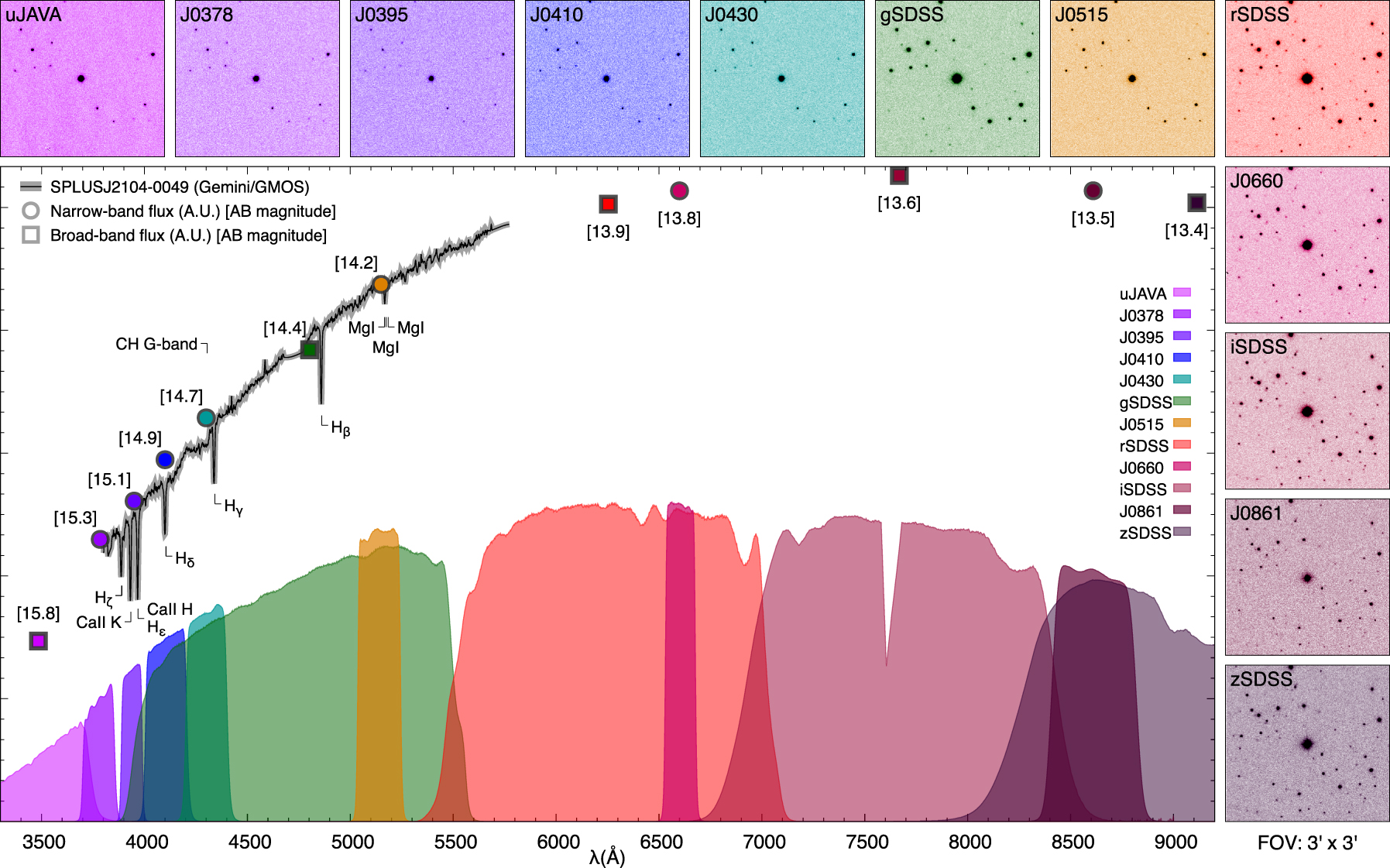 Outside panels: 12-band S-PLUS images for SPLUS J2104−0049, retrieved from the Astro Data Lab. The field of view is 3′ × 3′, with the north direction up and east to the left. The color of each image is based on the central wavelength of the Javalambre filters, which are named at the top left part of each image. Main panel: transmission curves measured for the set of 12 Javalambre filters, which include the effect of the entire system (sky, mirrors, lenses, and CCD). Also shown are the Gemini/GMOS spectrum (black solid line), the fluxes in the narrowband (filled circles) and broadband (filled squares) filters—calculated from the AB magnitudes (in square brackets). The Gemini/GMOS spectrum is available as the data behind the Figure. The transmission curve data can be obtained from https://github.com/splus-survey/filter_curves.