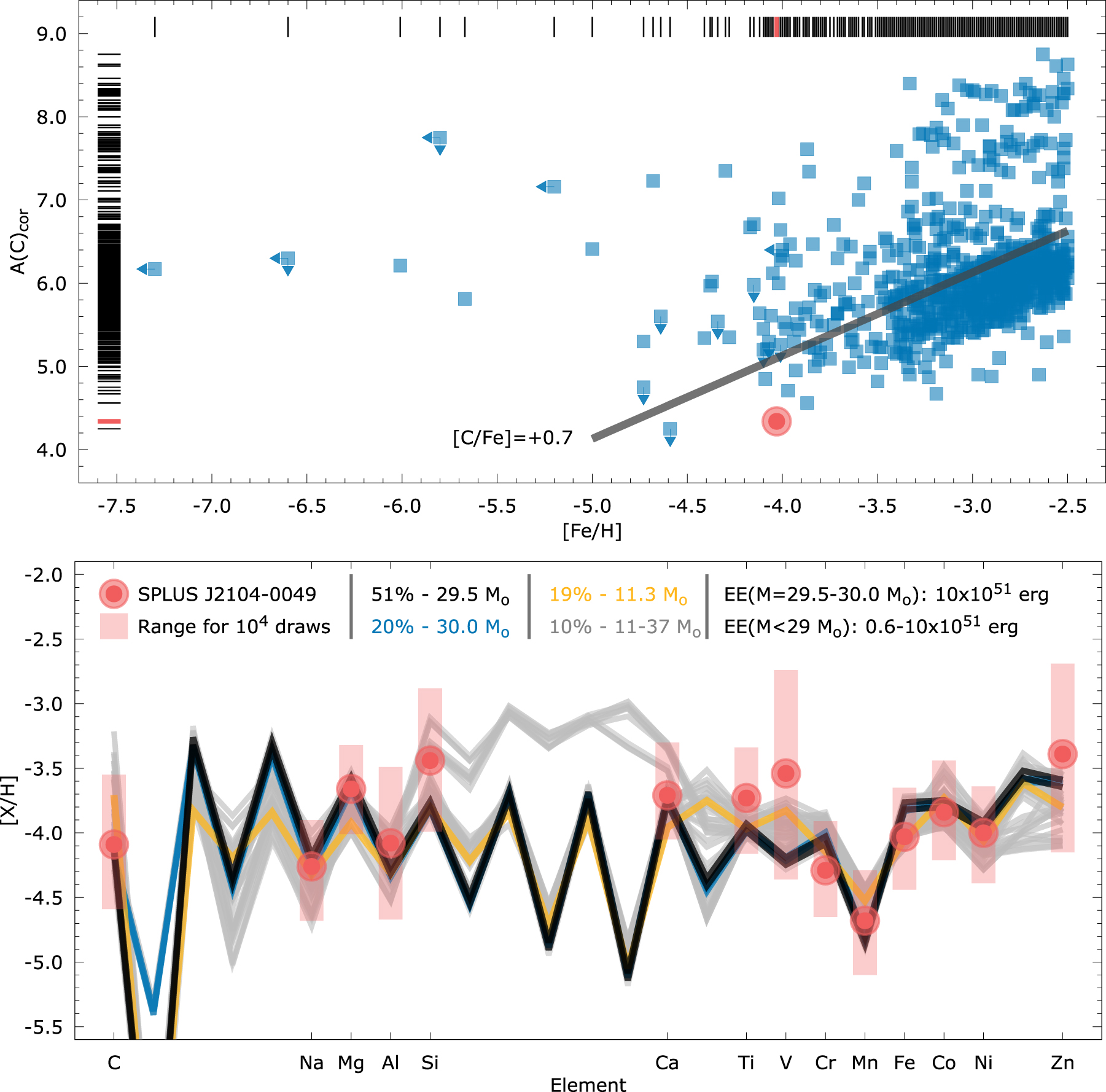Upper panel: carbon abundances—A(C)—as a function of the metallicity–[Fe/H]—for SPLUS J2104−0049 (filled circle) and the literature compilations JINAbase (Abohalima & Frebel 2018) and SAGA (Suda et al. 2008) (filled squares). The solid line represents the current criteria for CEMP stars ([C/Fe] = +0.7). Upper limits are only shown for [Fe/H] ≤ −4.0. Stripe-density profiles are also shown, with the values for SPLUS J2104−0049 highlighted. The upper panel is also available as a Bokeh-generated interactive figure. Hovering the mouse over any point will reveal the underlying data including the name, atmospheric parameters, carbon abundances, upper limit flags, and source. Other functionalities are available via the buttons at the top of the interactive figure. Hovering the mouse over each will reveal its functionality, i.e., panning, zooming, reset. The underlying data set is also available in machine-readable format via the figure data file link. A bigger version that will be updated as more data become available is available at http://vmplacco.github.io/files/acfeh.html. Lower panel: best model fits for SPLUS J2104−0049. The solid lines show the theoretical predictions from the Heger & Woosley (2010) znuc2012.S4 models, color coded by mass and occurrence fraction within the 104 simulations. The explosion energies (EEs) are also listed. The solid circles are the measured abundances for SPLUS J2104−0049, and the shaded areas mark the range of simulated abundances.