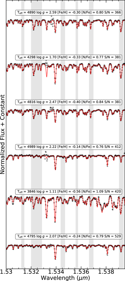 High-resolution near-IR H-band spectra (black empty squares) of six arbitrary stars identified as potential members of the GCD population, covering a small portion of the observed spectral regions around the 12C14N band (gray bands). The best-fit models based on the ASPCAP/APOGEE-2 spectral synthesis are superposed (red lines).