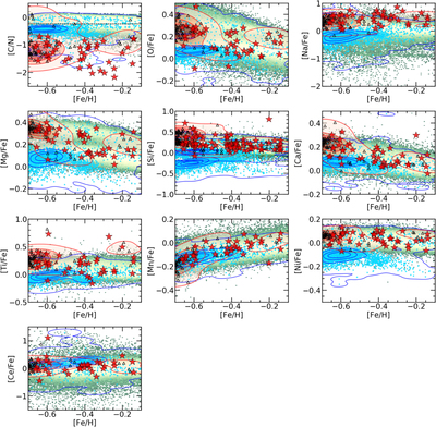Chemical-abundance patterns of selected elements for the relatively high-metallicity GCD population (red filled stars) compared to the MW stars (green 2D density histogram), dwarf galaxy populations (cyan circles and blue contours), and GC populations (black empty triangles and red contours). The black dotted line highlighted in the [Fe/H]–[C/N] plane indicates the limit above which extra-mixing episodes are expected to take place (see, e.g., Shetrone et al. 2019).