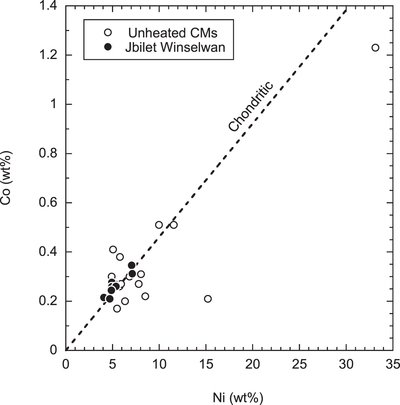 Nickel and Co concentrations of Fe–Ni metal grains in Jbilet Winselwan and unheated CMs. The data of Jbilet Winselwan are much less scattered than those of unheated CMs, suggesting homogenization during thermal metamorphism. Data of unheated CMs are from Kimura et al. (2011).