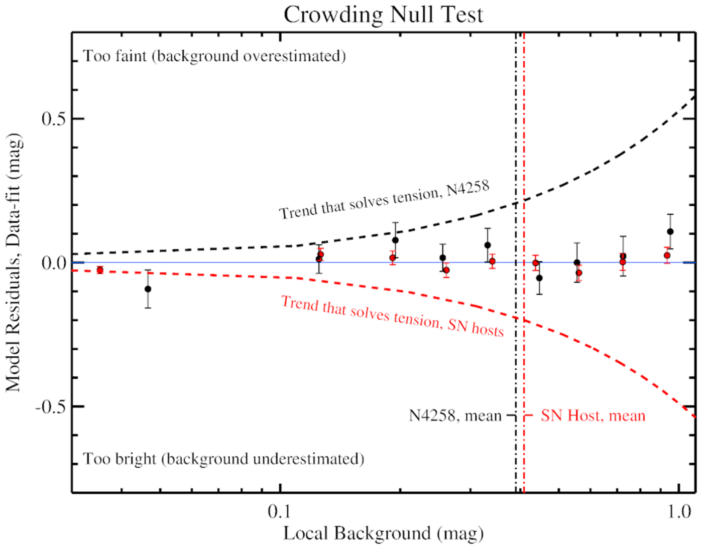 Mean differences between Cepheid photometry and distance-ladder fit versus the local background measured by artificial stars (in units of the Cepheid magnitudes), binned in equal numbers of Cepheids. Red is for Cepheids in SN Ia hosts and green for Cepheids in the anchor NGC 4258, with vertical lines indicating the mean background of each set. An underestimate of Cepheid backgrounds in SN Ia hosts at a level of 0.2 mag for the mean Cepheid background or an overestimate of Cepheid backgrounds in NGC 4258 by 0.2 mag for the mean Cepheid (indicated), or half that level for both simultaneously, would be required to solve the tension, but these possibilities are inconsistent with the data, which are consistent with no overestimates or underestimates for either set. Furthermore, it is hard to imagine how an overestimate or underestimate would not similarly affect (and therefore cancel) Cepheids in both NGC 4258 and SN Ia hosts.