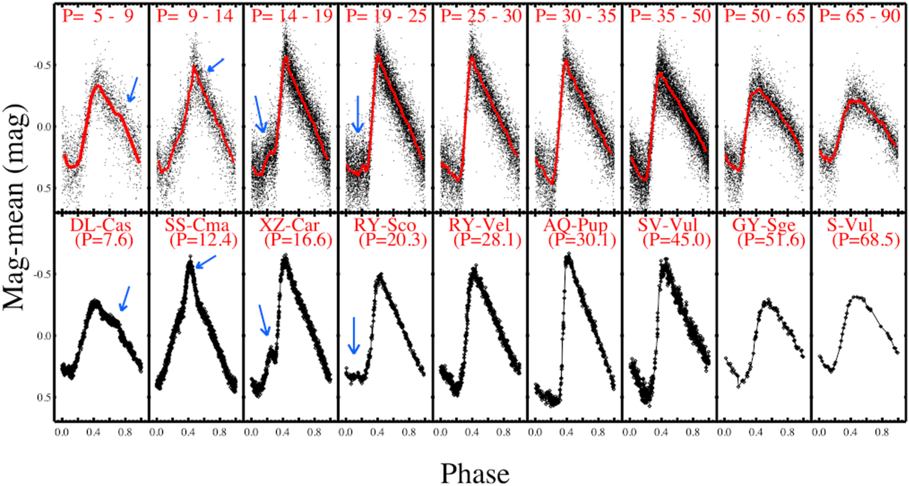 Composite visual (F555W) or white-light (F350LP) Cepheid light curves binned by period (upper) and compared with individual MW Cepheids near the middle period of the bin. The “Hertzsprung progression” (relation between light-curve shape and period) is apparent, including subtle features like the progression in phase of a resonance “bump” between the second overtone and fundamental pulsation for P < 20 days. The red line is a cubic spline constrained by the averages of bins in phase.