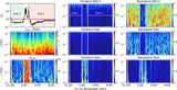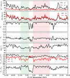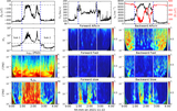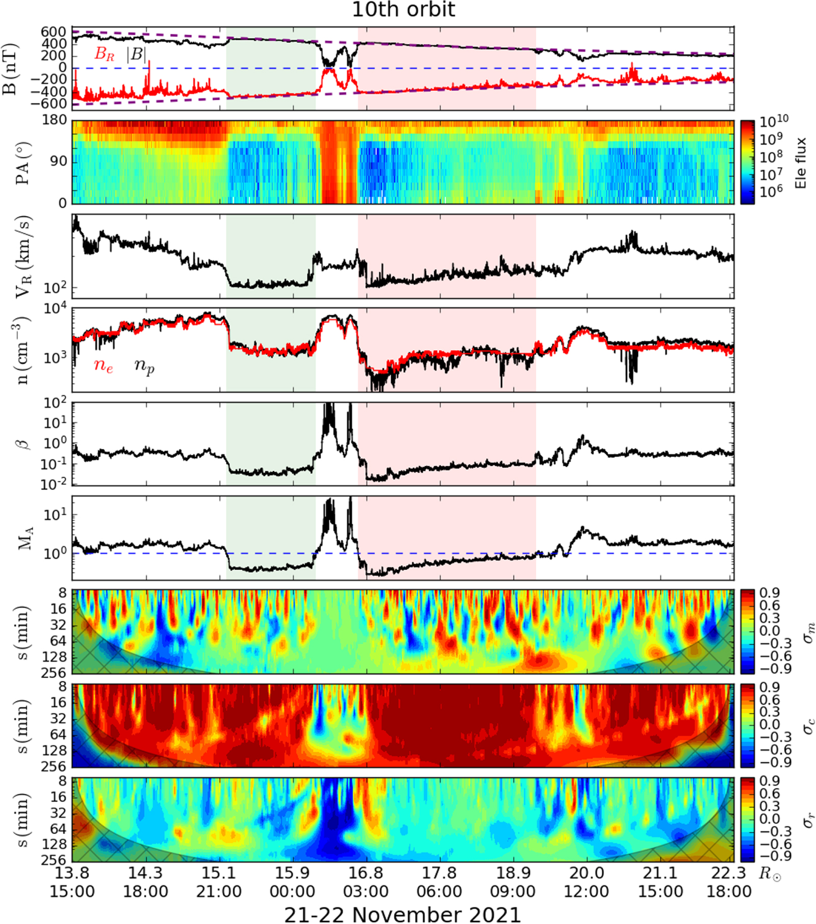 Solar wind parameters observed by PSP during E10. Panels from top to bottom show the magnetic field radial component B R (red line), magnitude ∣B∣ (black line), and the 1/r 2 field scaling (purple dashed line) predicted by the Parker spiral model, PAD of 526 eV superthermal electrons from SPAN-E, solar wind proton radial speed V R , proton density n p from SPAN-I (black line) and electron density n e from the QTN spectrum (red line), proton plasma beta β, and radial Alfvén Mach number M A ; and the spectrogram of the normalized reduced magnetic helicity σ m , normalized cross-helicity σ c , and normalized residual energy σ r . The shaded cross areas in the bottom three panels are determined by the cone of influence (COI) during the wavelet transform. Scales larger than the COI are subject to edge effects and are not reliable. The two sub-Alfvénic solar wind intervals are indicated by green and pink shaded areas, respectively.