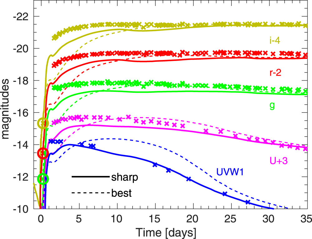 UVW1 and Ugri broadband magnitudes for the best-fit model “best” (dashed curves) and the model “sharp” with the compact CSM (solid curves), and SN 2021yja.
