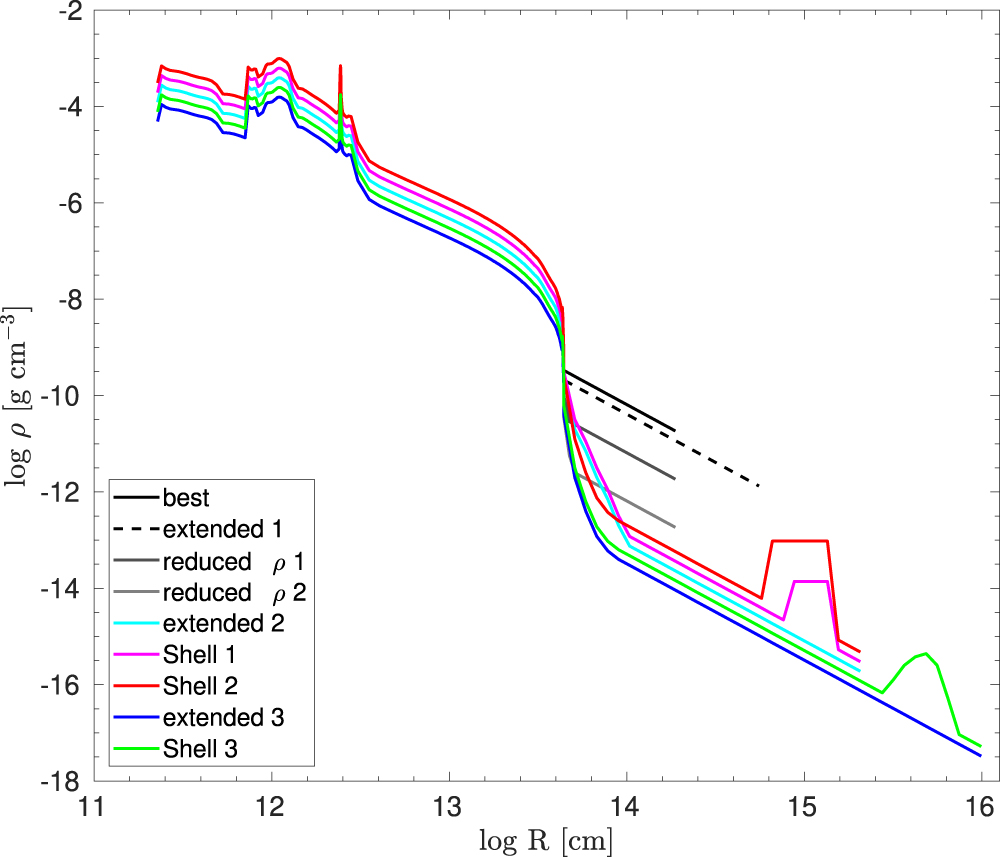 Density structures of the models with CSM structures specified in Table 1. The profiles of the models “extended 1” (−0.2), “extended 3” (−0.4), “Shell 1” (+0.2), “Shell 2” (+0.4), and “Shell 3” (−0.2) are shown with different offsets (specified in parentheses) for clarity.