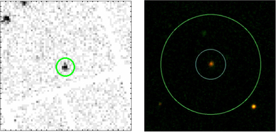 (left) XMM-Newton pn image; (right) PanSTARRS irg bands converted to RGB image. Green circles have a 20″ radius, and the cyan circle has a 6″ radius; all are centered on the optical source coordinates.