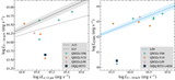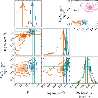Corner plot of results with (a) CABS∗ZWABS∗POW, restrictive prior on Γ (blue); (b) BNSPHERE, physically representative prior on Γ (orange), and (c) CABS∗ZWABS∗POW, fixed Γ = 1.9 (green). Best-fit values for each parameter are shown with a solid line. (Top right) L 2–10 vs. Γ contour with the IR-predicted luminosity shown (Stern 2015, dashed line)—the luminosity contours for the lightly obscured models are decisively below this level. Also shown are the results for the 12% scattered “leaky sphere”, which is closer to predicted (pink).