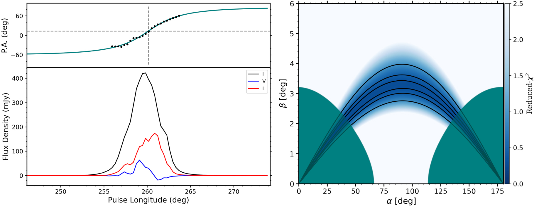 Left: the polarization profile at 1.25 GHz, including total intensity (black curve), linear polarization (red curve), and circular polarization (blue curve). Upper panel shows the linear polarization position angle in degrees, and green curve represents the fitting result using RVM model. Right: the results of fitting an RVM curve for each (α, β) combination. The reduced chi-squared of the fit is expressed in terms of color depth, with darker blue values corresponding to a better fit. The black contours correspond to 1σ−, 2σ−, and 3σ confidence boundaries. The green areas indicate the constraints given according to certain theoretical assumptions and observed parameters.