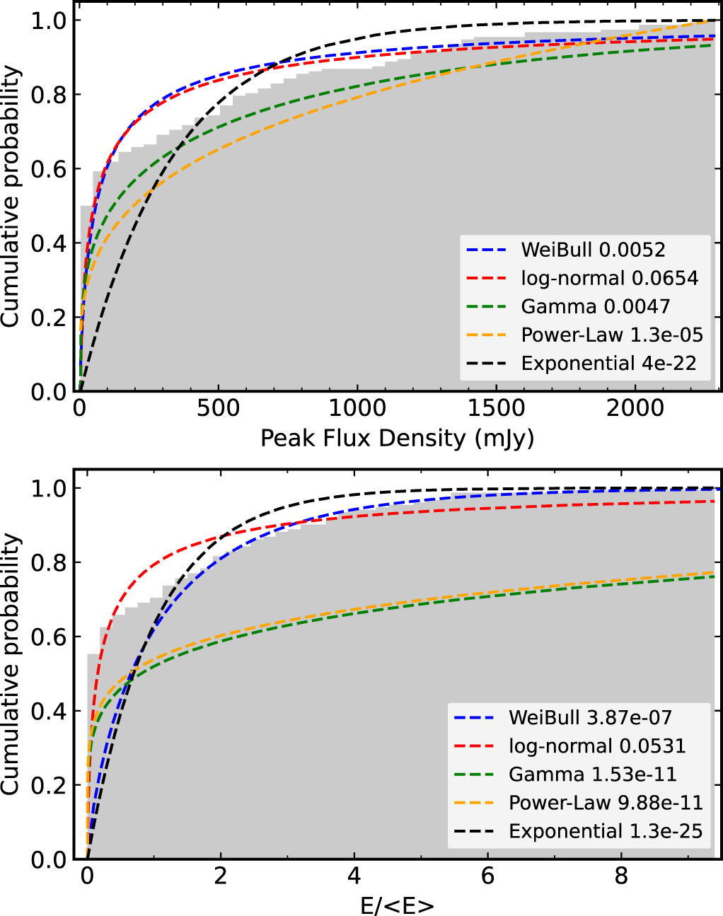 Normalized cumulative distribution of pulse peak flux (upper panel) and the energy (the lower panel) for single pulses detected. The best-fit log-normal is shown in the red dashed curve. In addition we fit the distribution with a pure Weibull (blue), gamma (green), power law (orange), and exponential (black), respectively, which cannot describe the observed distribution well. The numbers in the legend are the p values corresponding to the fitted distributions.
