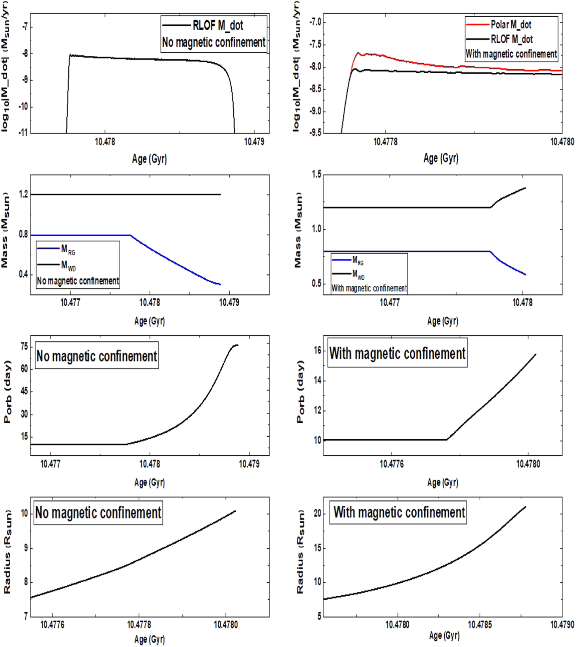 Detailed evolution of CO WD+RG binaries as a function of time using the MESA code. The left panels show the case of a nonmagnetic WD and the right panels the case of a magnetized WD (with B = 2.5 × 107 G). All other initial parameters are the same: the initial masses of the WDs and donor stars are 1.2 M ⊙ and 0.8 M ⊙, respectively, with an initial orbital period of 10 days. The evolution of mass transfer, WD/donor mass, orbital period, and the radius of the donors are shown. Wind mass loss is very low (<5 × 10−13 M ⊙/yr) and is not shown for clarity. RLOF M_dot and Polar M_dot in the figures are ﹩{\dot{M}}_{\mathrm{RL}}﹩ and ﹩{\dot{M}}_{{\rm{p}}}﹩ in the text, respectively.