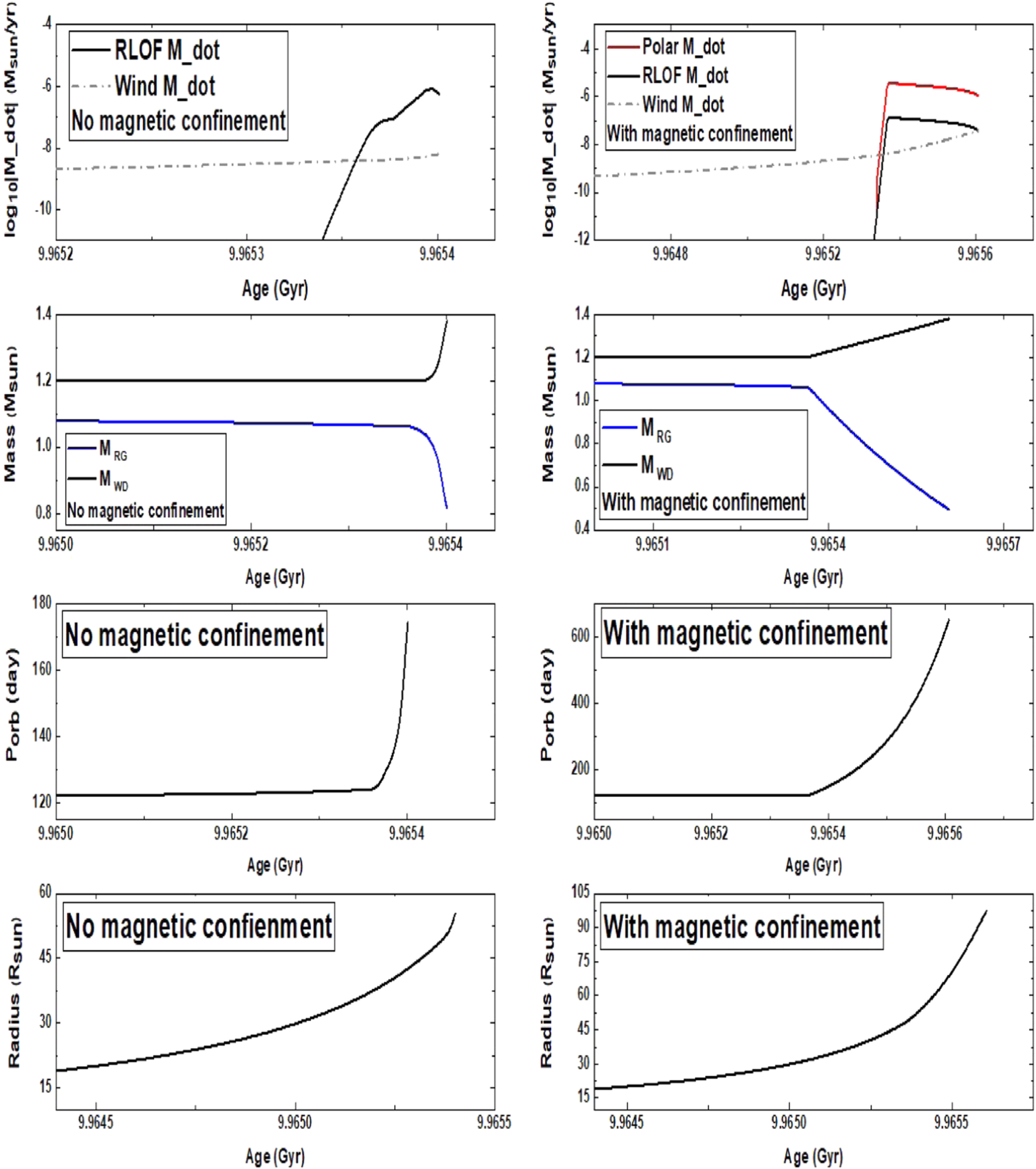 Another example for the detailed evolution of CO WD+RG binaries using the MESA code: evolution of mass transfer, wind mass loss, WD/donor mass, orbital period, and radius of the donors are shown as a function of time. The right and left panels are for a nonmagnetized and highly magnetized WD (B = 2.5 × 107 G) with magnetic confinement, respectively. The initial masses of the WD and RG donors are 1.2 and 1.1 M ⊙,and the initial orbital period is 120 days for both cases.