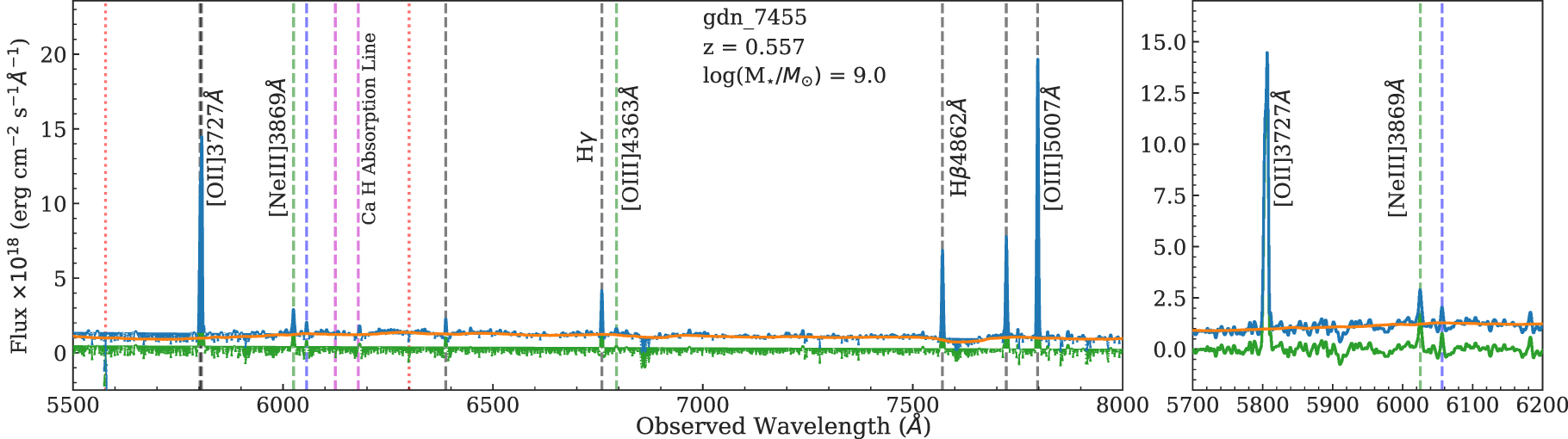Left: example spectrum of a HALO7D dwarf emission-line galaxy. The blue solid line gives the observed spectrum. The orange solid line shows the continuum estimate, and the green solid line shows the continuum-subtracted spectrum. Prominent emission lines are labeled and indicated by vertical dashed lines. Black and gray dashed lines indicate strong and/or Balmer series emission lines. Green dashed lines indicate typically fainter ionized metal lines, and the blue dashed line shows the location of a blend of the faint He I λ3889 and Hζ emission lines. The two magenta dashed lines show the locations of the Ca H and K stellar absorption lines though these features are not prominent in this spectrum, which has little stellar continuum due to its low stellar mass as well as a likely young stellar population. Right: a zoom-in on the spectrum showing the [OII]λλ3727,3729 doublet, as well as the [NeIII]λ3869 emission line and He I–Hζ blend.