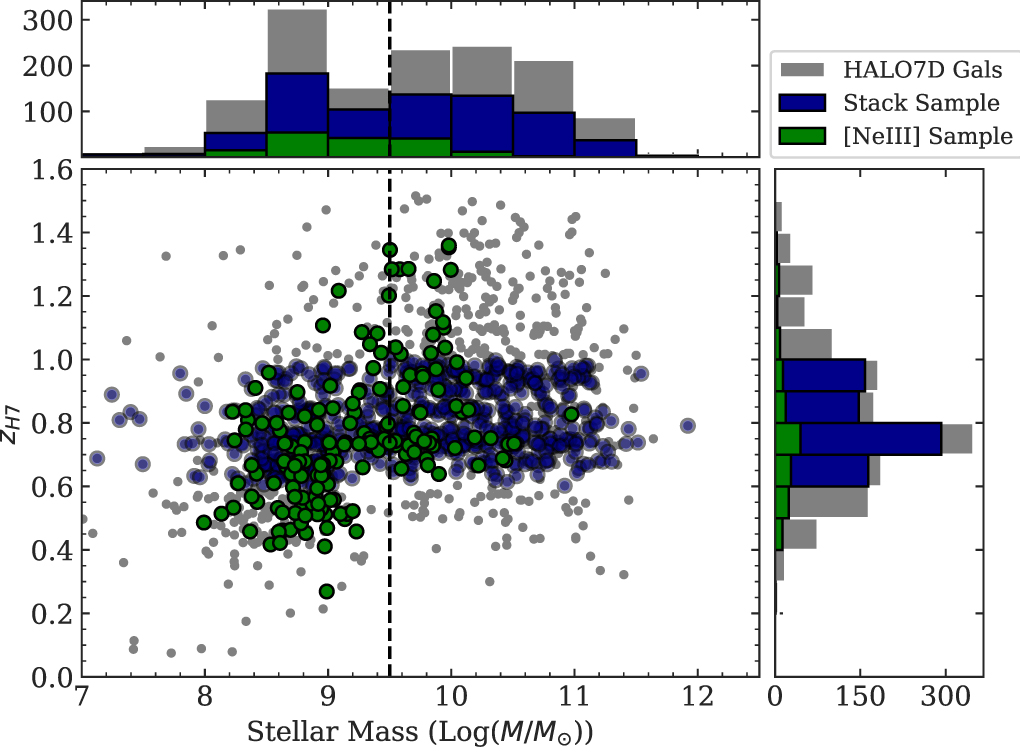 The stellar mass vs. redshift distribution of the HALO7D galaxy sample. The vertical dashed line separates the dwarf and massive galaxy populations, defined at ﹩\mathrm{log}({M}_{\star }/{M}_{\odot })=9.5﹩. The gray points and histograms indicate the overall sample of galaxies for which a good redshift fit was obtained from spectral features, as described in Pharo et al. (2022). The green points and histograms denote the subsample of galaxies with significant (S/N > 3) detections of the [NeIII]3869 and [OII]3727,3729 emission lines. This yields a sample of 167 galaxies (out of 1432 in the HALO7D catalog), including 112 dwarf galaxies (out of 646), with a redshift range of 0.3 < z < 1.4. The dark blue points and histograms indicate the emission-line galaxy sample used for composite galaxy stacking, described in Section 2.4.