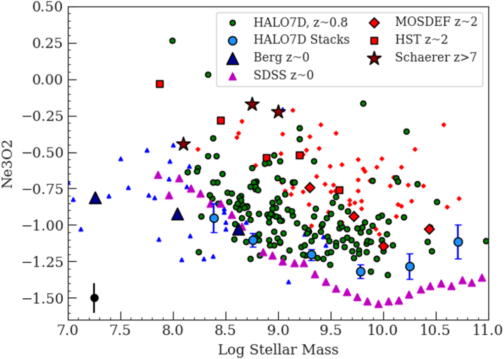 Ne3O2 vs. stellar mass for individual HALO7D galaxies (green circles) and composite HALO7D spectra (blue circles) compared with z ∼ 2 individual and composite measurements from J20 (red diamonds), local SDSS composite measurements from AM13 (purple triangles), and local low-mass individual detections (light blue triangles) and composite measures (blue triangles) from LVL. Measurements of three z > 7 galaxies are shown as crimson stars (Schaerer et al. 2022). Composite HALO7D spectra have lower Ne3O2 compared to the median individual detection at fixed stellar mass, suggesting the individual detections have higher excitation than the average for their mass and redshift. This relation holds in the z ∼ 2 and z ∼ 0 samples as well. Composite HALO7D spectra have similar Ne3O2 to z ∼ 0 stacks at low mass, indicating that the Ne3O2 behavior does not evolve substantially from z ∼ 1 to z ∼ 0. The median error of individual HALO7D galaxies is given in black in the lower left.