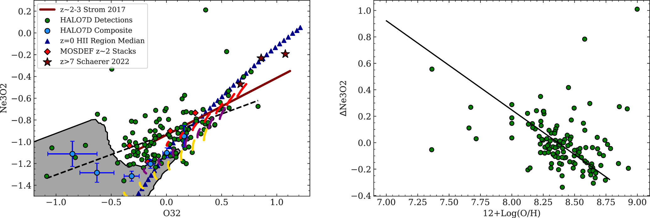 Left: Ne3O2 vs. O32 for individual HALO7D galaxies (green circles) and composite HALO7D spectra (blue circles) compared with 2 < z < 3 composite spectra from J20 (red diamonds) and individual measurements from S17 (maroon line). We also include median values for local H II regions (blue triangles) assembled in J20 from Pilyugin & Grebel (2016), Croxall et al. (2016), and Toribio San Cipriano et al. (2016). The gray shaded region indicates the 90% boundary for local SDSS galaxies measured in S17. The dashed black line shows a linear fit of the HALO7D points. Individual [NeIII]λ3869 detections in HALO7D exhibit comparable ionization properties to (typically more massive) 2 < z < 3 galaxies but with high scatter that may be related to metallicity variations. The red, purple, and yellow curves give the BPASS models from S17. Right: the Ne3O2 offset from the linear Ne3O2-O32 fit as a function of the R23 metallicity.