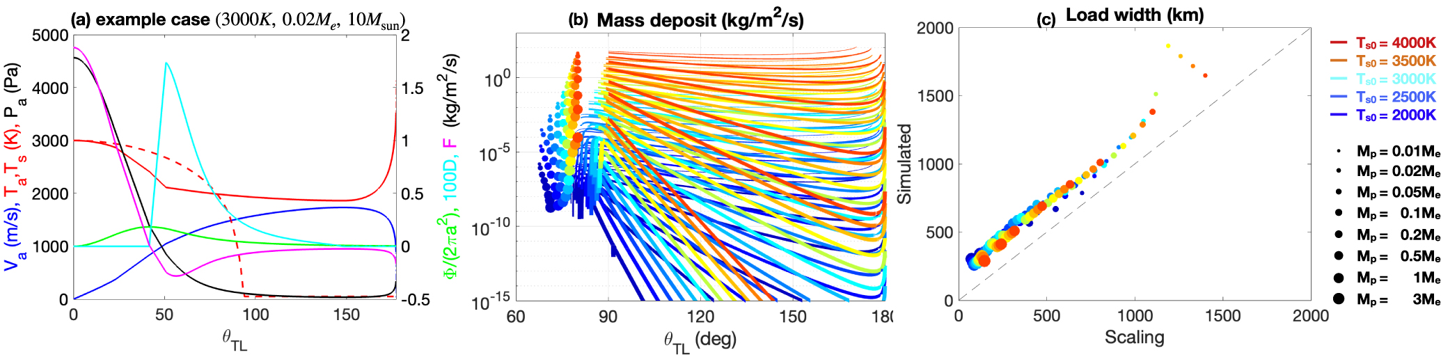 Panel (a) shows the air temperature T a (red, left), pressure P a (black, left), velocity V a (blue, left), surface temperature (red dashed, left), mass transport flux Φ (green, right), condensation D (cyan, right) and surface mass flux F (magenta, right) for an example case, where T s0 = 3000 K, M p = 0.02 M e and M ⋆ = 10 M Sun. Other stellar parameters can be derived from T s0 and M ⋆ following formula given in Table 1. Panel (b) shows the mass load profile. Mass deposited to the planetary surface by atmospheric flow out of the magma ocean can be sustained by the lithosphere, as shown by solid curves. Within the magma ocean edge (T s > T f = 1600 K), the total mass-loss rate per area is assumed to be evenly distributed, as shown by the vertical locations of the solid dots. The horizontal locations are set to the magma ocean edge minus 10°. Panel (c) compares the measured e-folding scale of the mass load out of the magma ocean l L against the theoretical prediction π RT s0/g. For panels (b) and (c), color indicates the temperature at the substellar point of the planet and line width, symbol size reflects the size of the planet; stellar mass M ⋆ is set to 10 M Sun.