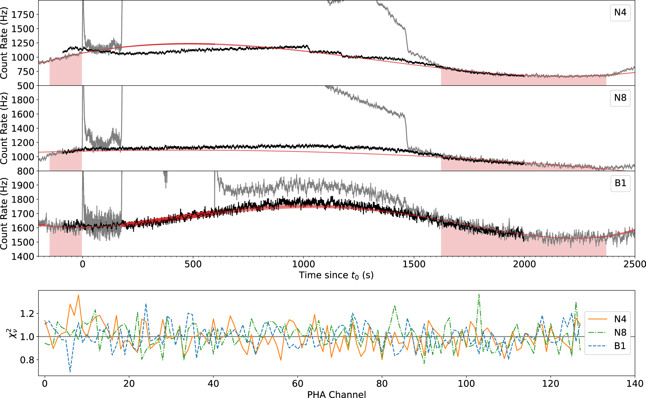 Top: the gray light curves are of GRB 221009A as seen in Fermi-GBM detectors N4, N8, and B1. The black light curves are the averaged background from 30 orbits before and 30 orbits after the Fermi-GBM trigger time, when Fermi was in the same orbital location and orientation. The red shaded regions mark the background selection regions used for polynomial fitting. The red lines are the fourth order polynomial fits to the GRB 221009A light curves that best match the averaged orbital background. The gray shaded area on the right marks the time when the GRB was occulted by the Earth. The discrepancy at t = 0 between the gray GRB light curve and the black averaged background light curve in panel N4 is due to the propagation of the Earth occultation steps in the orbital fits (as seen around 1100 s and 1200 s). The polynomial order and background range can be found in Section 5. Bottom: the ﹩{\chi }_{\nu }^{2}﹩ fits of the polynomial fit to the GRB 221009A light curve in each of the 128 CSPEC energy bins for each detector.