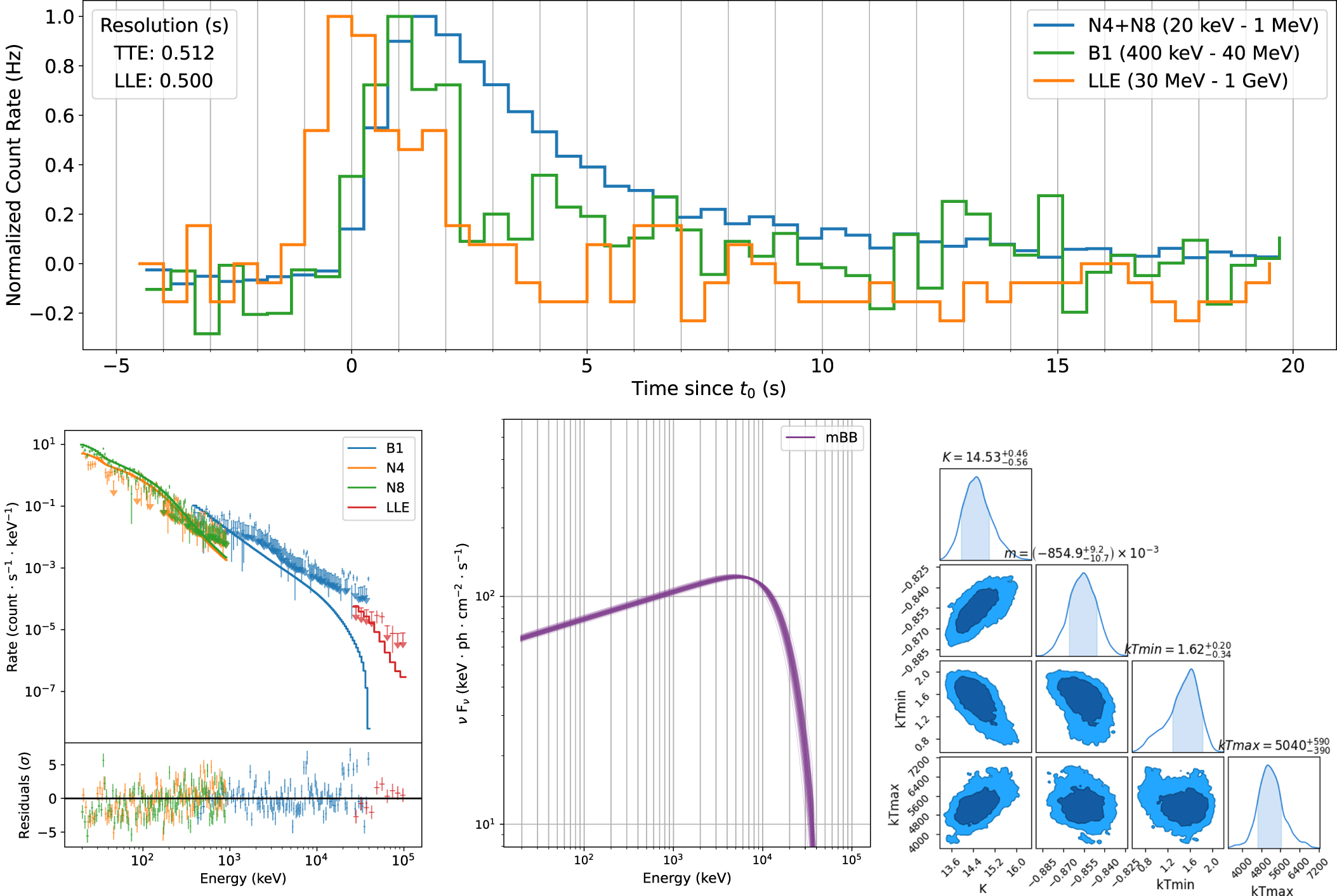 Top: background-subtracted and normalized light curves of 0.512 s binned Fermi-GBM TTE data and 1.0 s binned LLE data for the triggering pulse with the higher-energy photons arriving prior to the lower-energy photons. Bottom: the fitted counts spectrum (left), the model spectrum (center), and the posteriors of the model parameters (right) for the mBB function fitted to the triggering pulse.