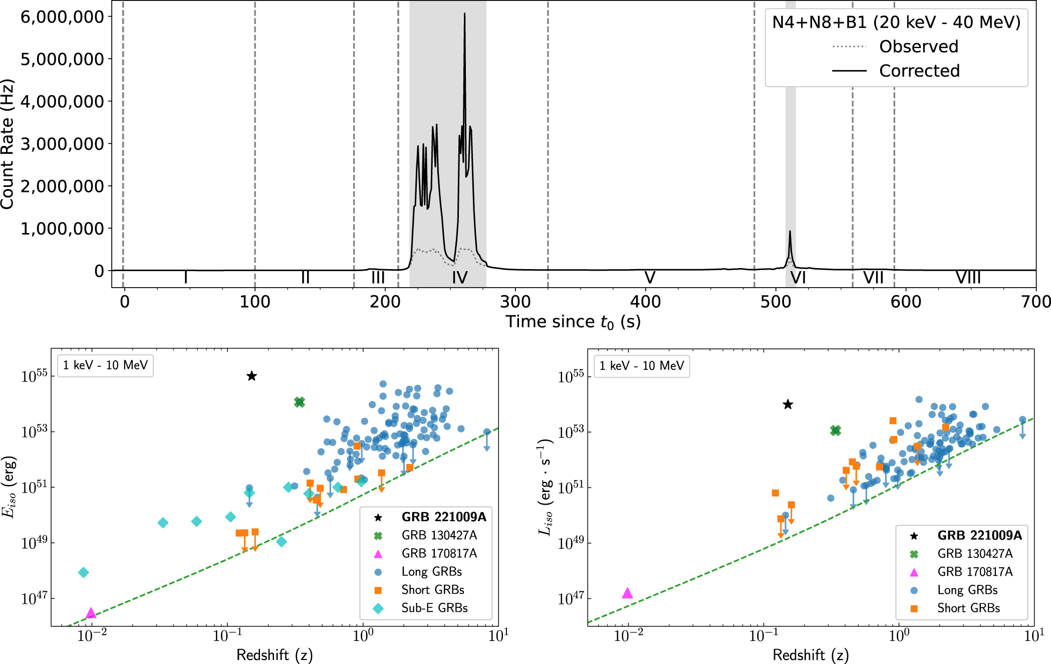 Top: the light curve of GRB 221009A from 8 keV to 40 MeV before and after PPU correcting in the Fermi-GBM BTI regions. Bottom: short and long GRB E iso (left) and L iso (right) measures of Fermi-GBM-detected GRBs with known redshift values through 2017 (Abbott et al. 2017), with updated spectral measures from Poolakkil et al. (2021). Key GRBs are highlighted. The downward arrows indicate GRBs best fit by a PL spectral model, which must turnover somewhere, so they are shown as upper limits. The E iso plot is supplemented with low- or intermediate-luminosity GRBs with associated supernova from Cano et al. (2017). We do not utilize their luminosity measures as they are averaged (not peak).