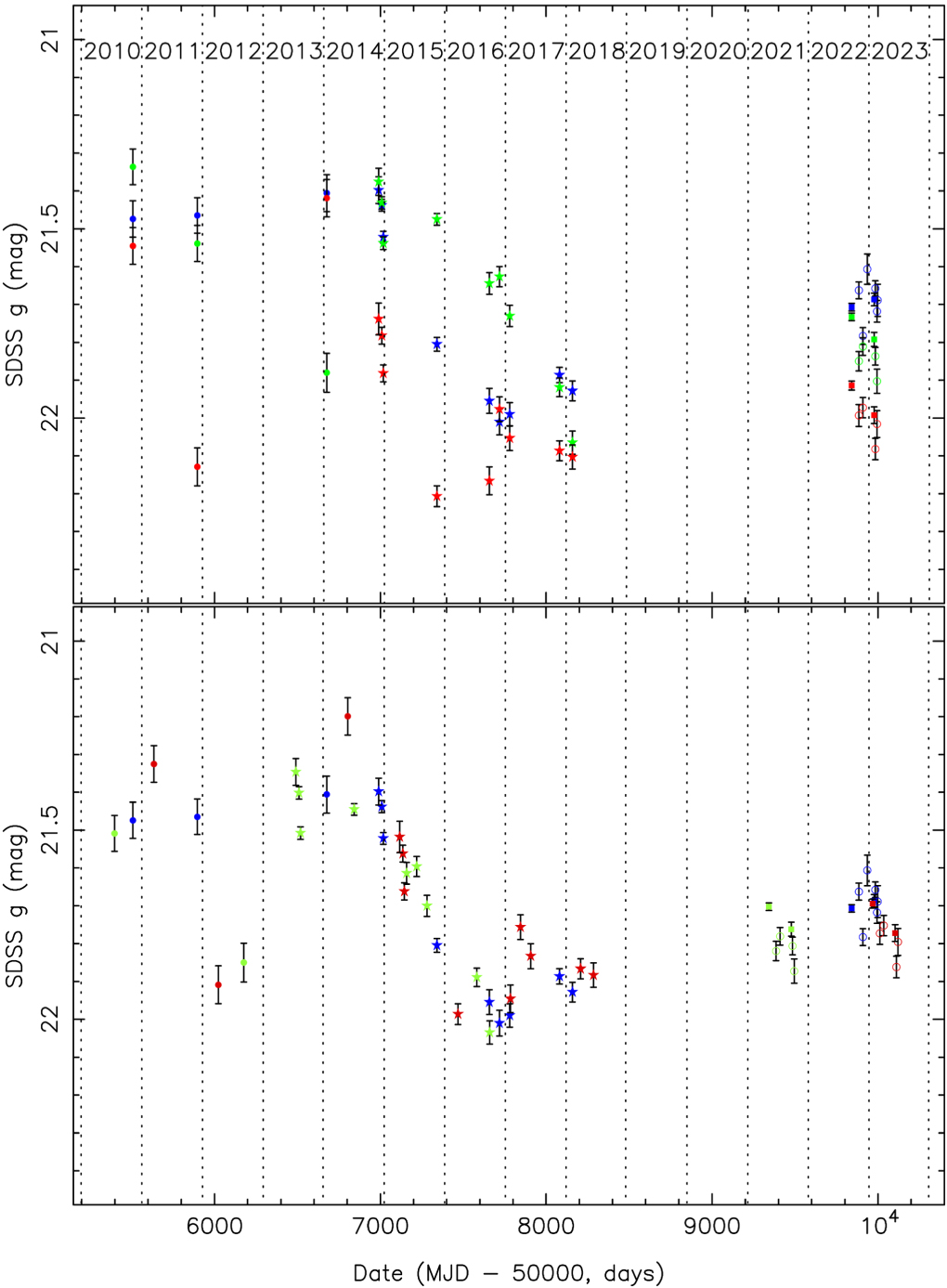 Top: the light curves of the quasar images A (blue), B (green), and C (red). The data points are aperture-photometry from Pan-STARRS (filled circles), DECaLS (filled stars), the Magellan Telescopes (filled squares), and the Nordic Optical Telescope (open circles). Bottom: the light curves for images B and C are shifted relative to image A by Δt AB = 499 and Δt AC = −127 days, the predicted time delays from the best-fit lens model. The data points of images B and C were then shifted vertically by 0.03 and 0.22 mag, respectively, to align with the light curve of image A (see Section 6).