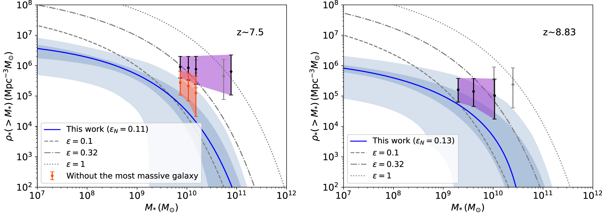 The comoving stellar mass density contained within galaxies that are more massive than M * at z ∼ 7.5 and z ∼ 8.9. The gray data points and lines are reproduced from Figure 2 in Boylan-Kolchin (2023). The solid blue lines are the best-fit ρ *( > M *) considering the best-fit result of SFE at z = 8 and z = 9, respectively. The slightly dark blue regions represent the 90% credible regions of the estimated ρ *, while the light blue regions represent the additional contributions of cosmic variance (CV). The purple regions show the updated observations from Labbé et al. (2023). Particularly, in the left panel, the orange region represents the cumulative stellar mass density excluding the single/most massive galaxy with ﹩\mathrm{log}({M}_{* }/{M}_{\odot })\sim 10.89﹩, suggesting that such a single galaxy dominates and magnifies ρ *( > M *) significantly. This most massive galaxy has not been confirmed or excluded by spectroscopic evidence because of no data up to now.