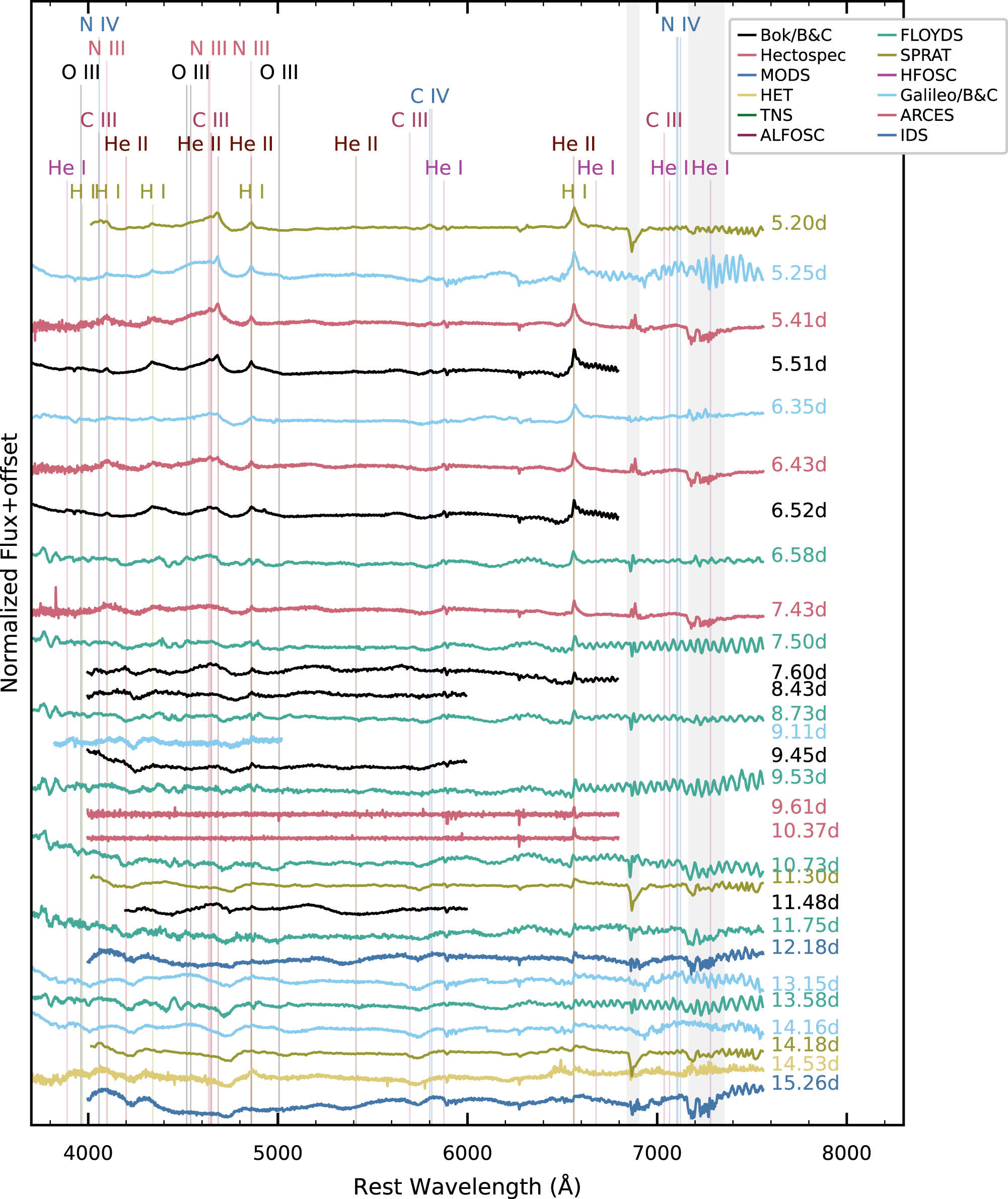 (a) The evolution of the optical spectra of SN 2023ixf over the first ∼5.2 days, with the earliest epoch at the top of the figure. Spectra are color coded by the instrument used to observe them, normalized by a blackbody fit, and corrected for redshift. Emission lines are identified at their rest wavelengths with vertical lines and labeled at the top of the figure, while the most prominent telluric features are marked with the shaded gray region. Throughout this sequence, the spectra evolve from showing strong, narrow emission lines from high-ionization species to intermediate width features as the CSM is accelerated by the shock. The spectra evolve rapidly between 1.18 and 1.67 days, with the He I and N III (λλ4634.0,4640.6)/C III (λλ4647.5,4650.0) lines disappearing within the first 0.5 day from the first spectrum while He II (λ4685.5), N IV, and C IV gain strength. (b) Continuation of Figure 1 showing the evolution of the optical spectra of SN 2023ixf from days 5.2 to 14.5 with the earliest epoch at the top of the figure. Over the first 7 days, the spectra evolve from showing strong, narrow emission lines from high-ionization species to a nearly featureless spectrum with an intermediate with P Cygni profile in Hα. In the subsequent 7 days, broad P Cygni profiles develop in the higher-order Balmer features.