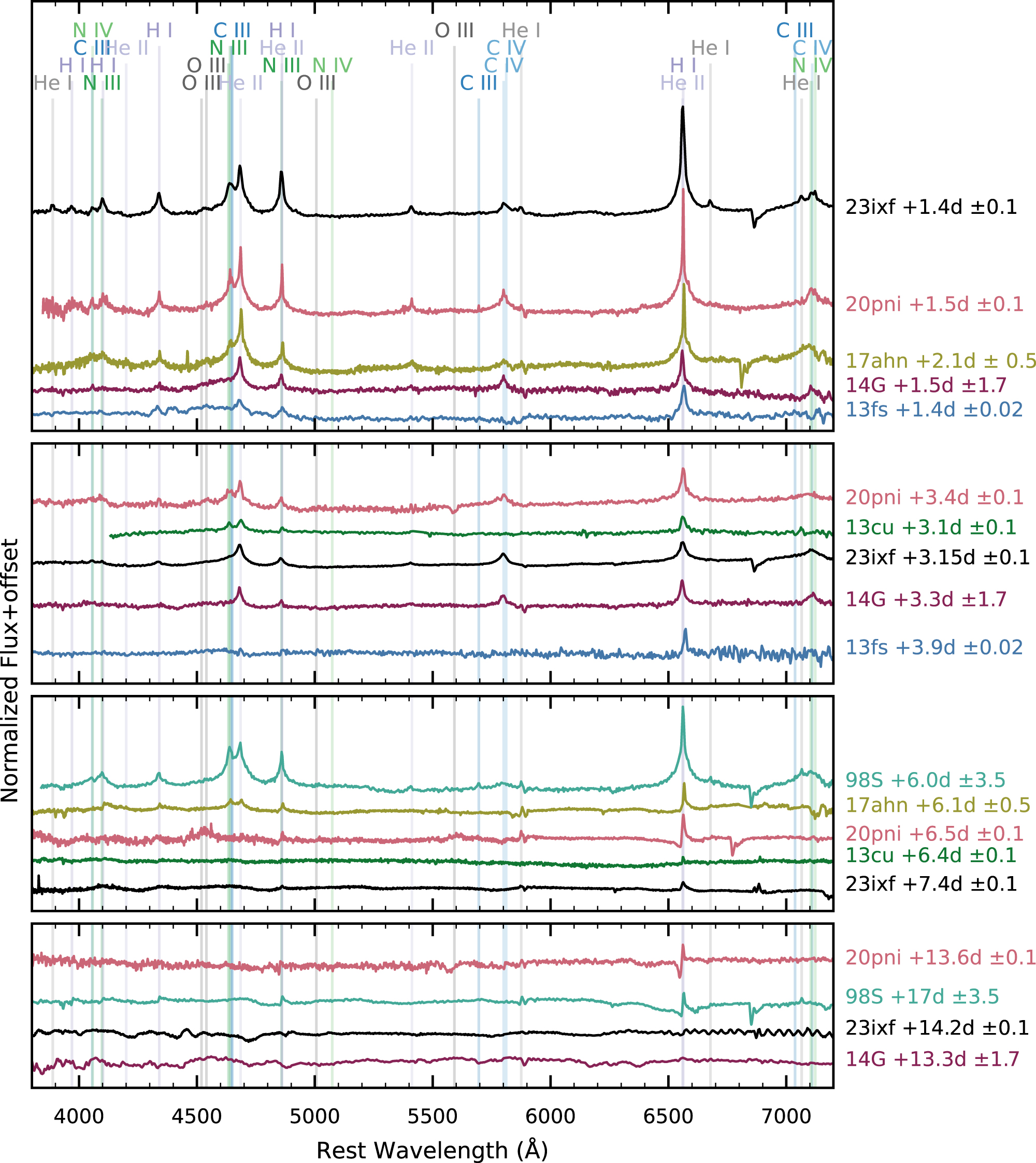 A comparison of SN 2023ixf (black) to SN 1998S (teal; Leonard et al. 2000), SN 2013fs (blue; Yaron et al. 2017), SN 2013cu (green; Gal-Yam et al. 2014), SN 2014G (purple; Terreran et al. 2016), SN 2017ahn (mustard; Tartaglia et al. 2021), and SN 2020pni (pink; Terreran et al. 2022) ∼1, 3, 7, and 14 days after explosion. These SNe all have flash features that evolve over the first two weeks. The SN name and epoch are marked to the right of the plot. All spectra have been redshift and extinction corrected and then normalized by a blackbody fit to the continuum. Emission lines identified in the first spectrum are marked with vertical lines, which are labeled at the top of the figure. In the first epoch, SN 2023ixf closely resembles SNe 2020pni and 2017ahn, although at later epochs it more closely follows SN 2014G. SN 2013fs is considerably different in its evolution throughout the first two weeks. At later epochs, SN 2020pni and SN 1998S develop narrow P Cygni profiles that are not present in the spectra of other SNe.