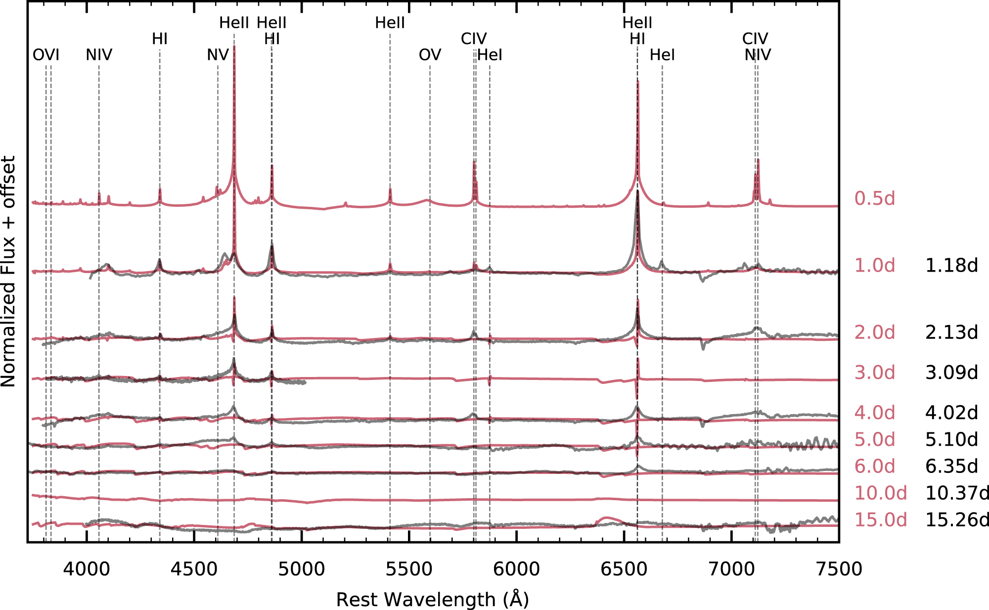 A comparison of the spectral evolution of SN 2023ixf (black) to the r1w4 model of Dessart et al. (2017; pink). Phases are shown to the right of the figure in pink for the model and black from the observed spectra. While the first observation at 1.2 days matches fairly well, the model spectra evolve much more rapidly, with P Cygni profiles developing at day 2 and all emission disappearing by day 4, while the observations show emission through days 6–7. The model spectrum at 0.5 day shows a number of lines that have faded by 1 day (e.g., N V).