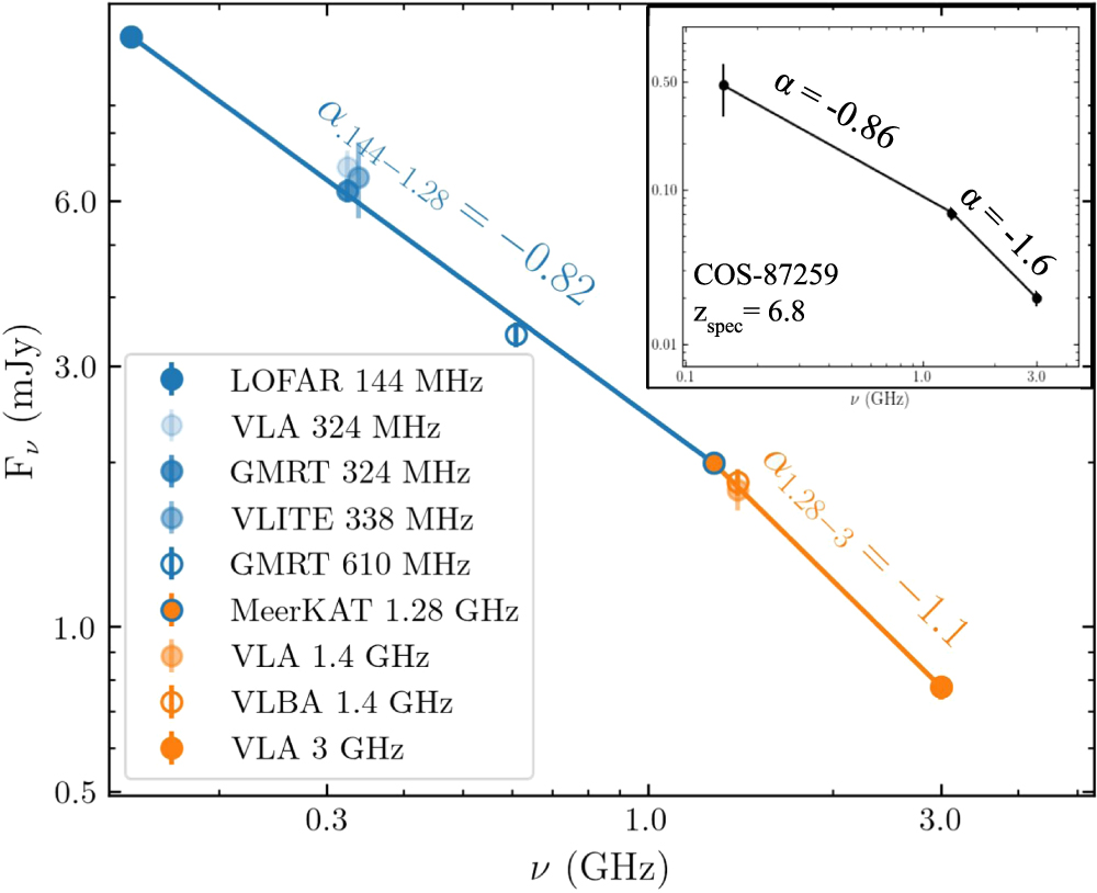 Radio SED: all fluxes and associated errors are listed in Table 1. We measure the spectral slope between two sets of radio frequencies (blue line, orange line) and find significant spectral steepening indicative of high-z RL AGN (Saxena et al. 2018a; Broderick et al. 2022; Endsley et al. 2023). In the upper-right corner inset, we show the radio SED for the z spec = 6.8 heavily obscured RL AGN from Endsley et al. (2023) for reference.