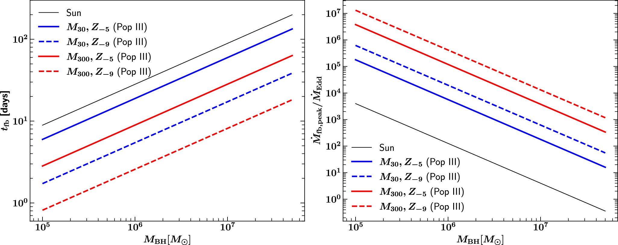 Left panel: debris mass fallback time t fb for tidal disruption of 300M ⊙ (M 300, red) and 30M ⊙ (M 30, blue) Pop III stars with Z = 10−5 (Z −5, solid lines) and Z = 10−9 (Z −9, dashed lines) compared to a regular 1M ⊙ star (black solid line). Right panel: Eddington ratio of the peak debris mass fallback rate ﹩{\dot{M}}_{\mathrm{fb},\mathrm{peak}}﹩ for the same stars as in the left panel. Pop III stars have shorter fallback times and much higher peak mass fallback rates compared to Pop I star TDEs.