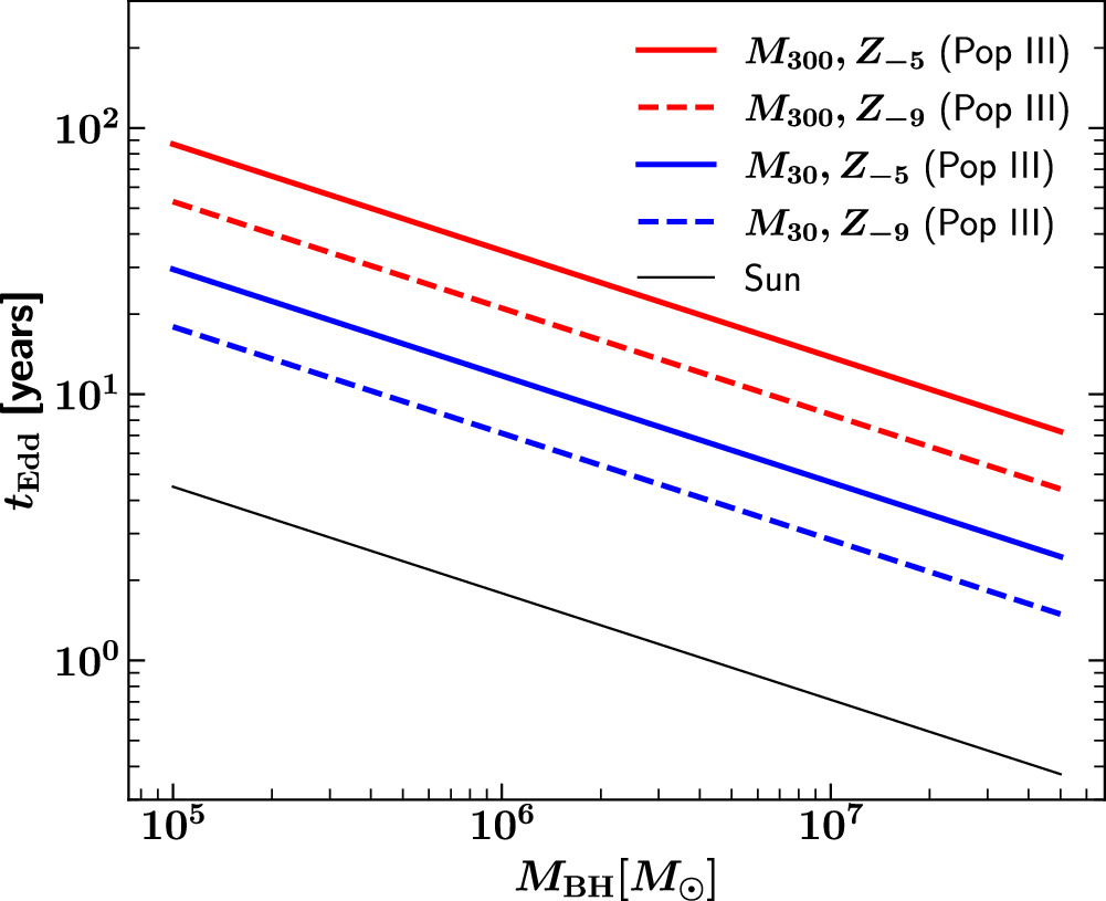 The Eddington timescale defined as the timescale that the debris mass fallback rate stays above the Eddington accretion rate. It is seen that Pop III star TDEs can stay super-Eddington for very long timescales (up to hundreds of years).