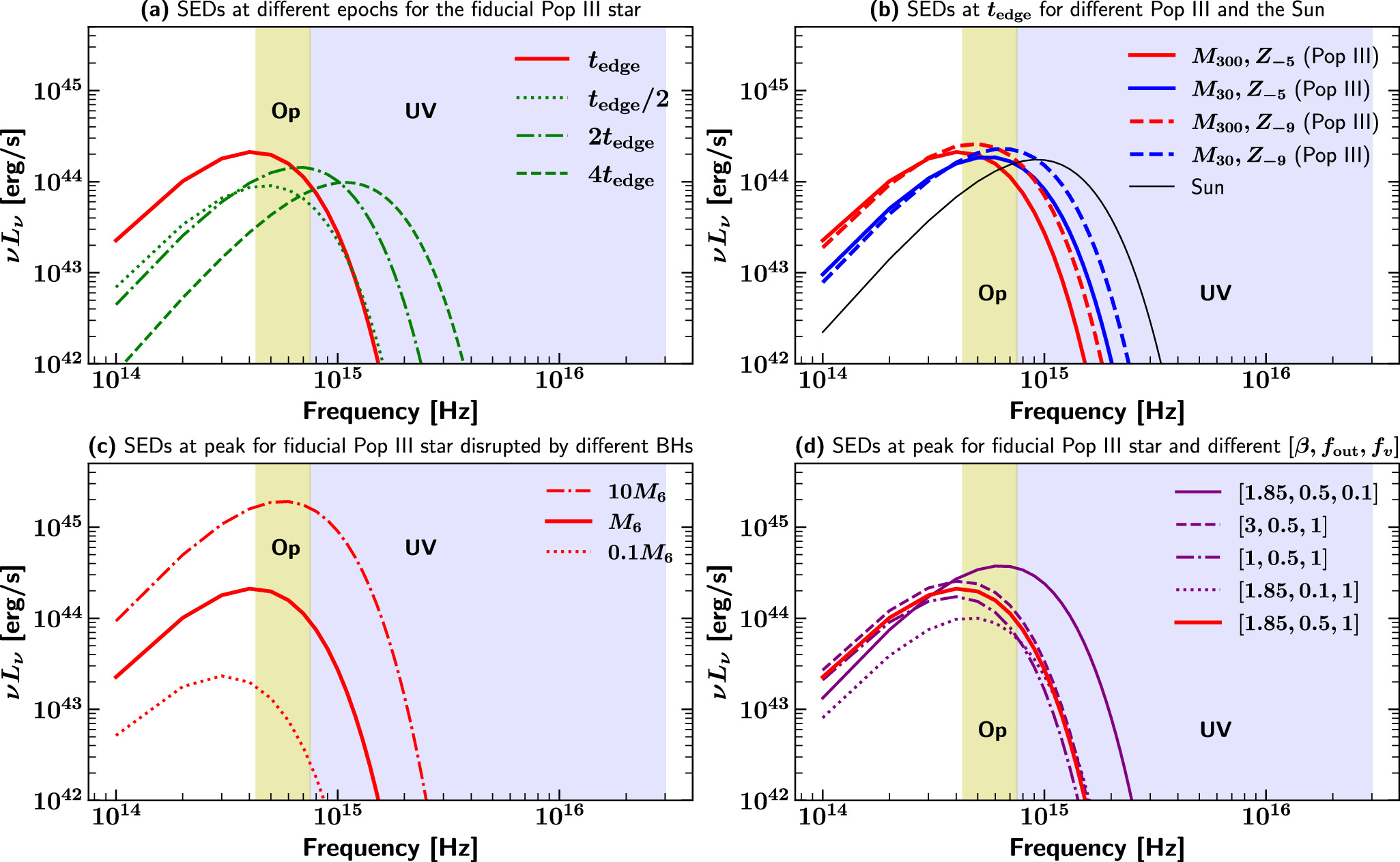 Spectral energy distributions (SEDs) of the Pop III star tidal flares in the rest frame of the host galaxy. The default parameter set used for plotting this figure and the those subsequent is M BH = 106 M ⊙, M ⋆ = 300M ⊙ (M 300), Z = 10−5(Z −5), f out = 0.5, f v = 1, and β = β c = 1.85 (the red solid curve) unless specified otherwise. (a) The evolution of the SEDs at different epochs: t edge/2, t edge (peak luminosity), 2× t edge, and 4× t edge. (b) The SEDs at t = t edge for various Pop III stars of different masses or metallicities and a solar-type star. (c) The dependence of the SEDs (at t = t edge) on M BH. (d) The dependence of the SEDs (at t = t edge) on other parameters including the mass outflow fraction (f out), the ratio between wind velocity and escape velocity (f v ), and the stellar orbital penetration parameter β (with β c = 1.85 being the critical value for full tidal disruption).