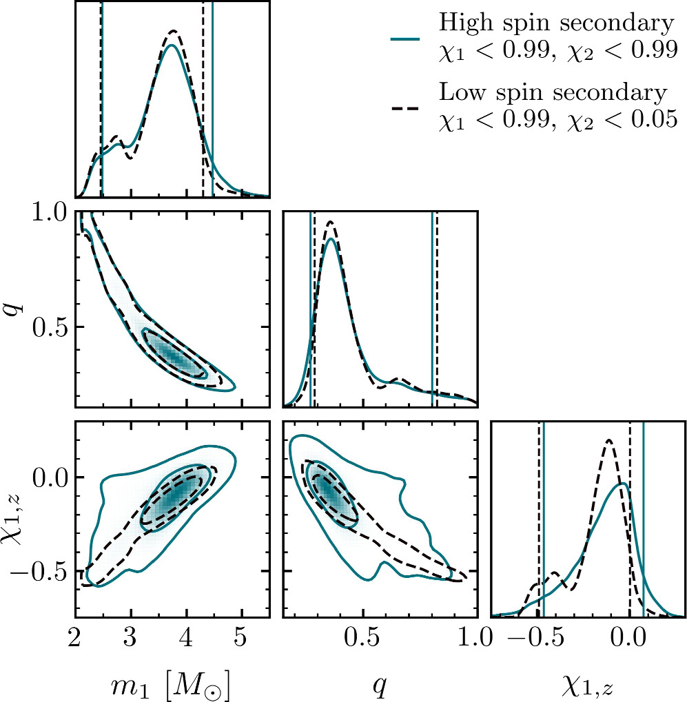 Selected source properties of GW230529. The plot shows the one-dimensional (diagonal) and two-dimensional (off-diagonal) marginal posterior distributions for the primary mass m 1, the mass ratio q, and the spin component parallel to the orbital angular momentum ﹩{\chi }_{1,z}\equiv {{\boldsymbol{\chi }}}_{1}\cdot {\hat{L}}_{{\rm{N}}}﹩. The shaded regions denote the posterior probability, with the solid (dashed) curves marking the 50% and 90% credible regions for the posteriors determined using a high-spin (low-spin) prior on the secondary of χ 2 < 0.99 (χ 2 < 0.05). The vertical lines in the one-dimensional marginal posteriors mark the 90% credible intervals.