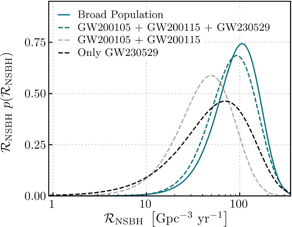 Posterior on the merger rates of NSBH systems. The solid and dashed lines represent the broad population-based rate calculation and the event-based rate calculation, respectively.