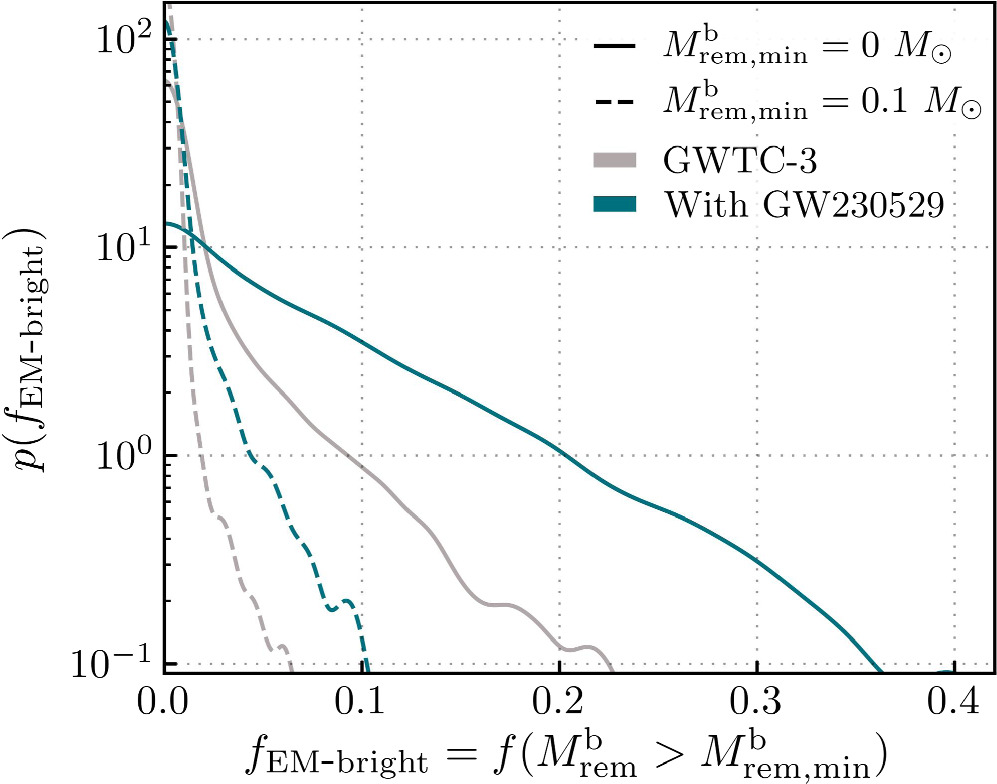 Posterior on the fraction of NSBH systems detected with GWs that may be EM bright, f EM-bright, depending on the threshold remnant mass required to power a counterpart, ﹩f({M}_{\mathrm{rem}}^{b}\gt {M}_{\mathrm{rem},\min }^{b})﹩. The solid and dashed curves represent different values of the minimum remnant mass ﹩{M}_{\mathrm{rem},\min }^{b}﹩. The teal and gray curves show the analysis results with and without GW230529, respectively.