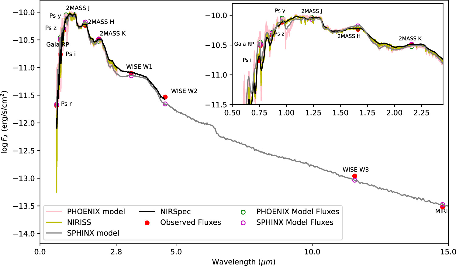 Near-IR and IR SED of TRAPPIST-1. Red symbols represent the observed photometric measurements. Blue symbols are the model fluxes from the best-fit SPHNIX atmosphere model (gray). Overlaid on the model are the absolute flux-calibrated spectrophotometric observations from NIRISS (yellow) and NIRSpec (black).