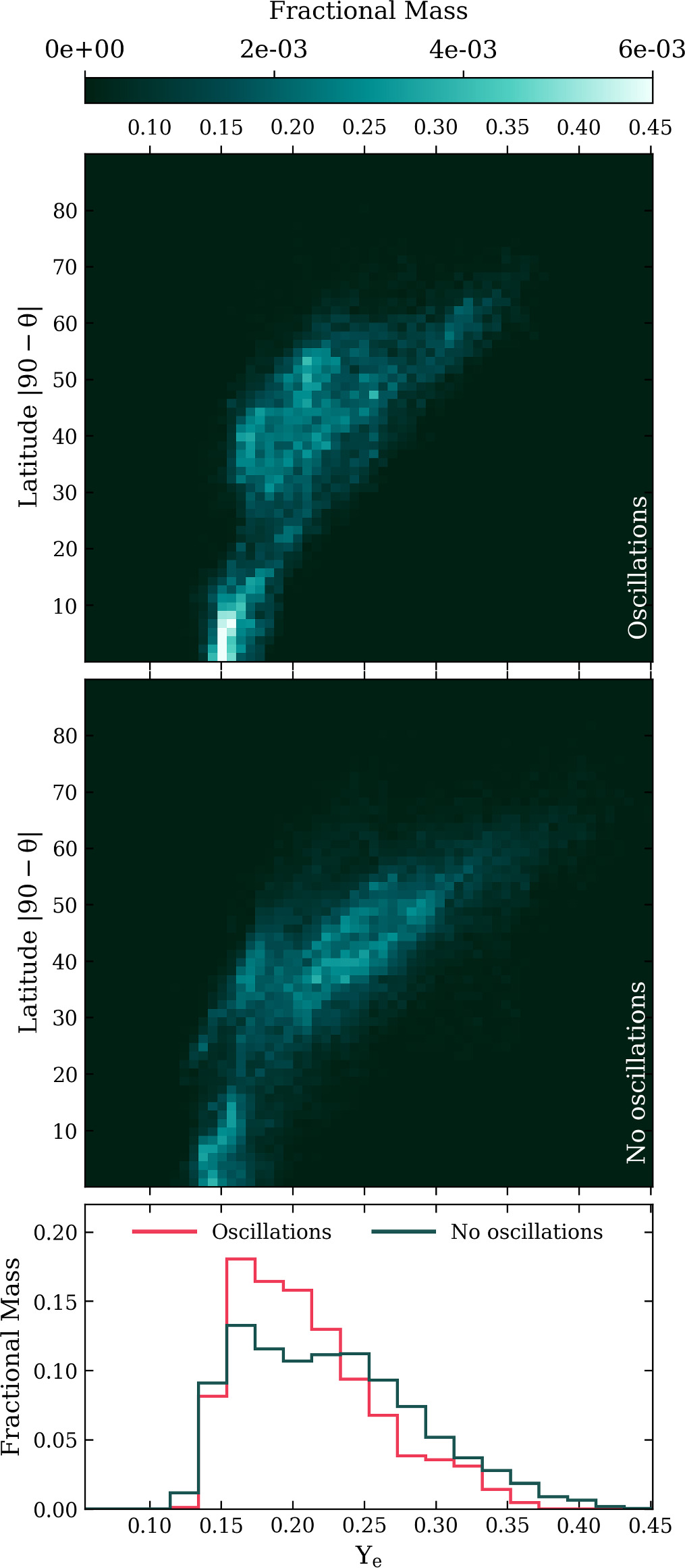 Mass distribution of Ye as the ejecta passes through 10 GK. The top two panels show the distribution of Ye as a function of latitude, with zero representing the plane of the disk. The bottom panel shows the fractional mass distribution for the simulation with (pink) and without (teal) oscillations. The outflow in the simulation with FFCs shifts to lower Ye, especially at higher latitudes, indicating enhanced neutron richness in the ejecta.