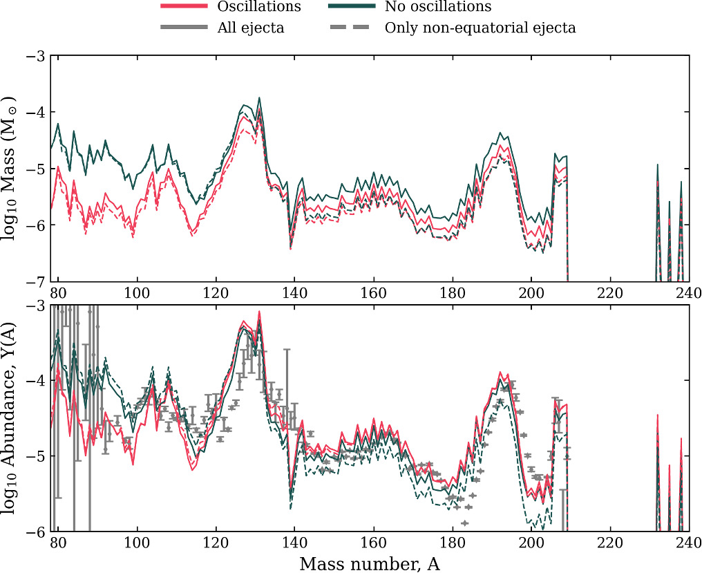 Top: total mass of each element produced, as a function of mass number. Bottom: mass-weighted relative abundances of each element produced, with solar abundances shown as gray diamonds. In each case, we plot both the yields from the outflows with (pink) and without (teal) oscillations. We show the results considering all ejecta (solid lines) as well as nonequatorial ejecta (dashed), as described in Section 3.