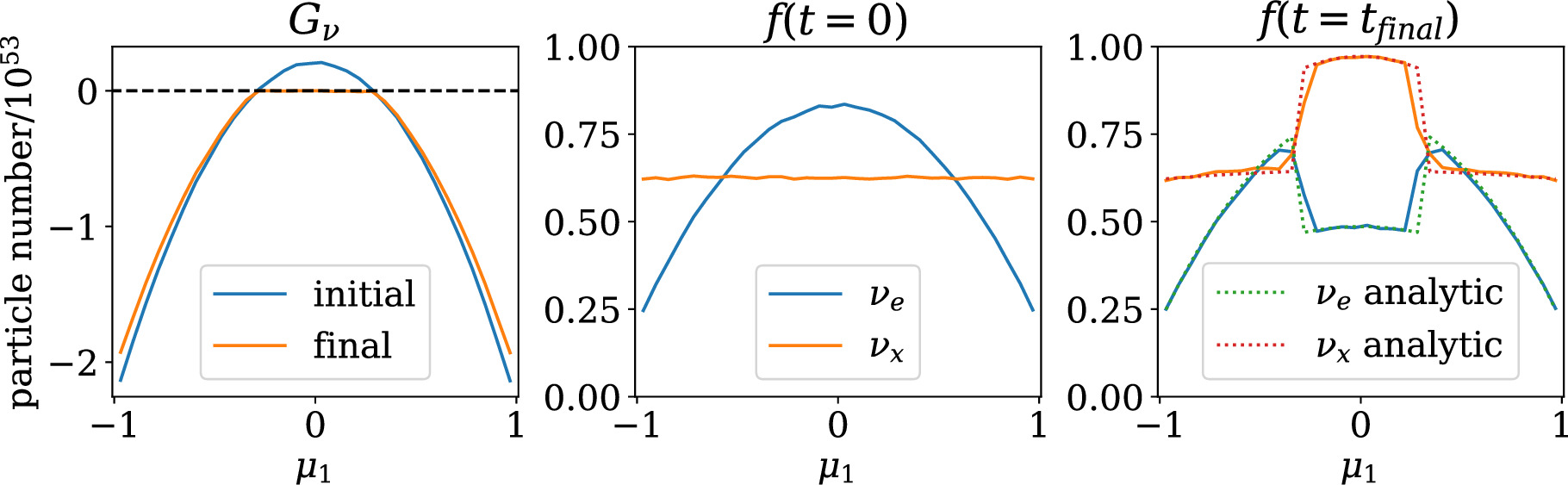 One-zone oscillation problem demonstrating efficacy of our scheme. Central panel shows angular distribution of electron and heavy neutrinos. Right panel shows final configuration, overlaid with the analytic solution. Left panel shows initial and final values of Gν. We initialize a neutrino field with a crossing, and our approach removes the crossing while conserving integrated Gν.